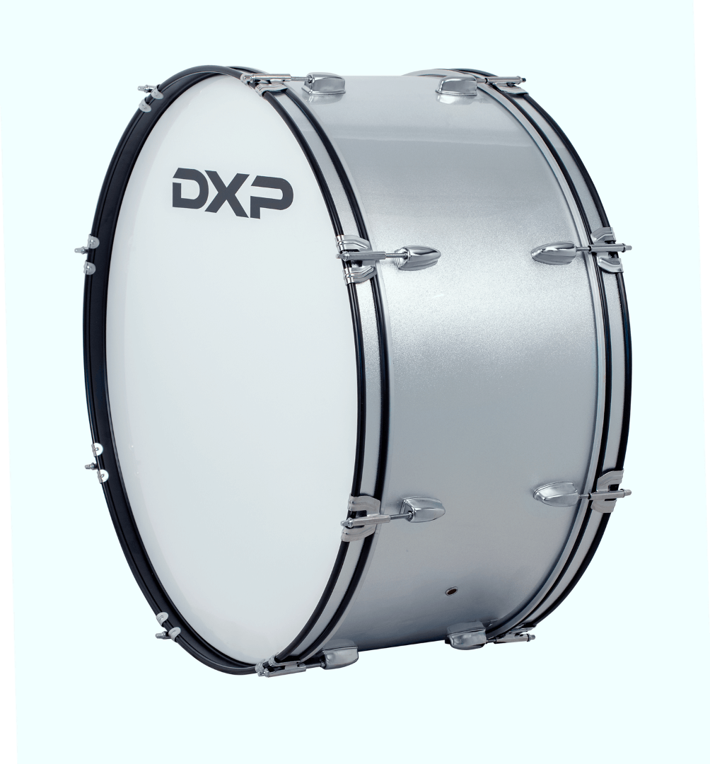 DXP Bass Drum. 28" x 12". 16 Lugs. Complete with Sling and Mallets. Metallic Silver in colour.
