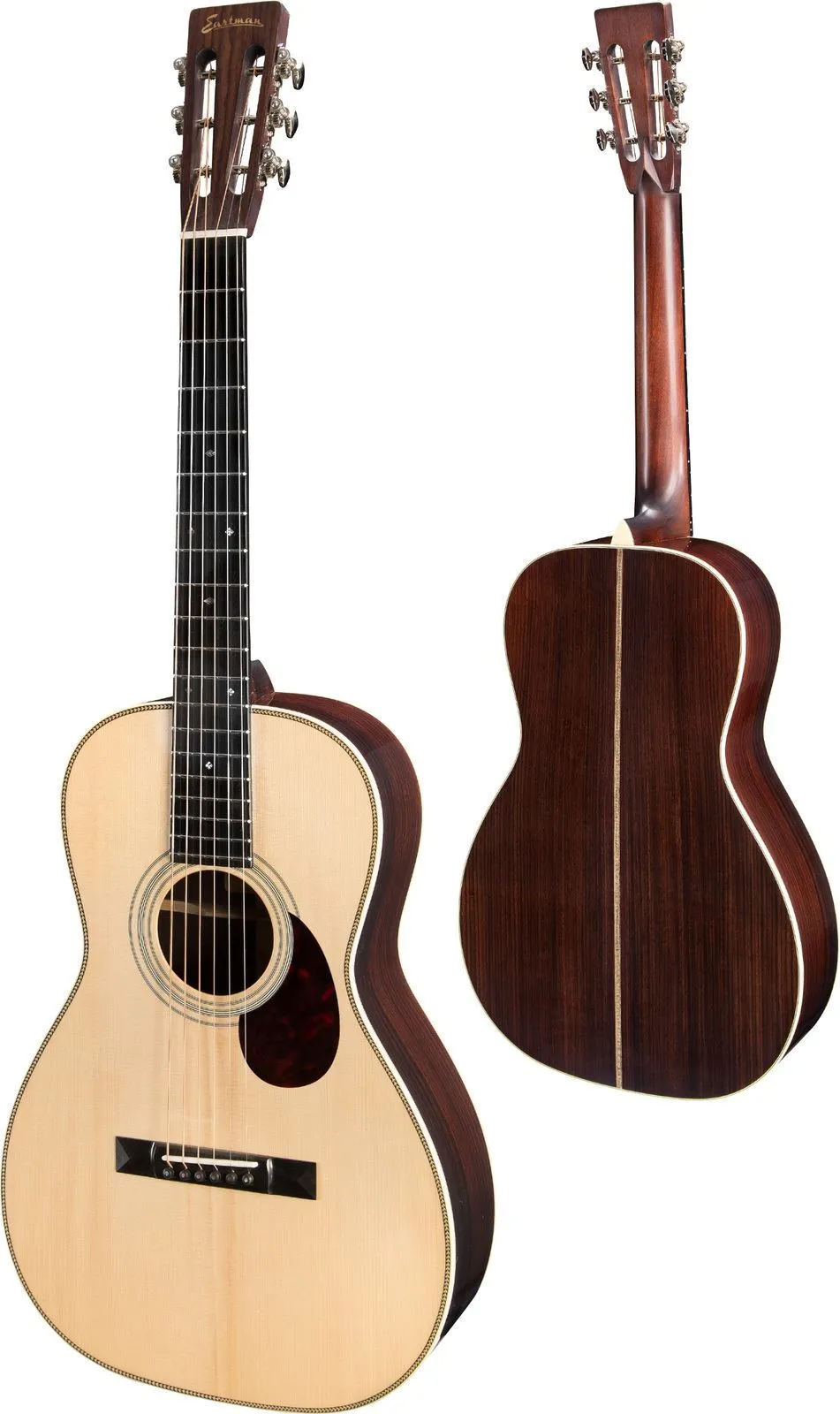 Originally designed to be played in small rooms, or “parlors”, the parlor guitar has a tight and focused sound. Eastman Parlor guitars are inspired by the great parlor guitars of the 30’s and 40’s. With a surprisingly loud voice and warm, balanced tone, the Eastman E20P Parlour Acoustic Guitar a great choice for fingerpicking style of playing. This beautiful guitar is hand crafted with a Solid Adirondack spruce top, solid rosewood back and sides with an ebony fingerboard for a dynamic response. Players and listeners alike are surprised by the volume and tonally quality of Eastman Parlor guitars, despite their diminutive size.
