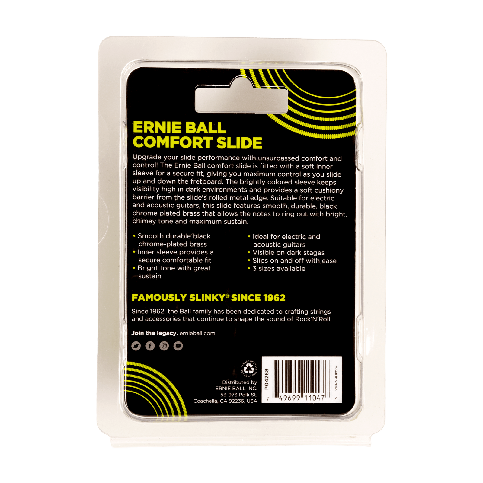 Upgrade your slide performance with unsurpassed comfort and control. The Ernie Ball comfort slide is fitted with a soft inner sleeve for a secure fit, giving you maximum control as you slide up and down the fretboard. The brightly colored sleeve keeps visibility high in dark environments and provides a soft cushiony barrier from the slides’ rolled metal edge. Suitable for electric and acoustic guitars, this slide features smooth, durable, black chrome plated brass that allows the notes to ring out with a bright, chimey tone and maximum sustain.
