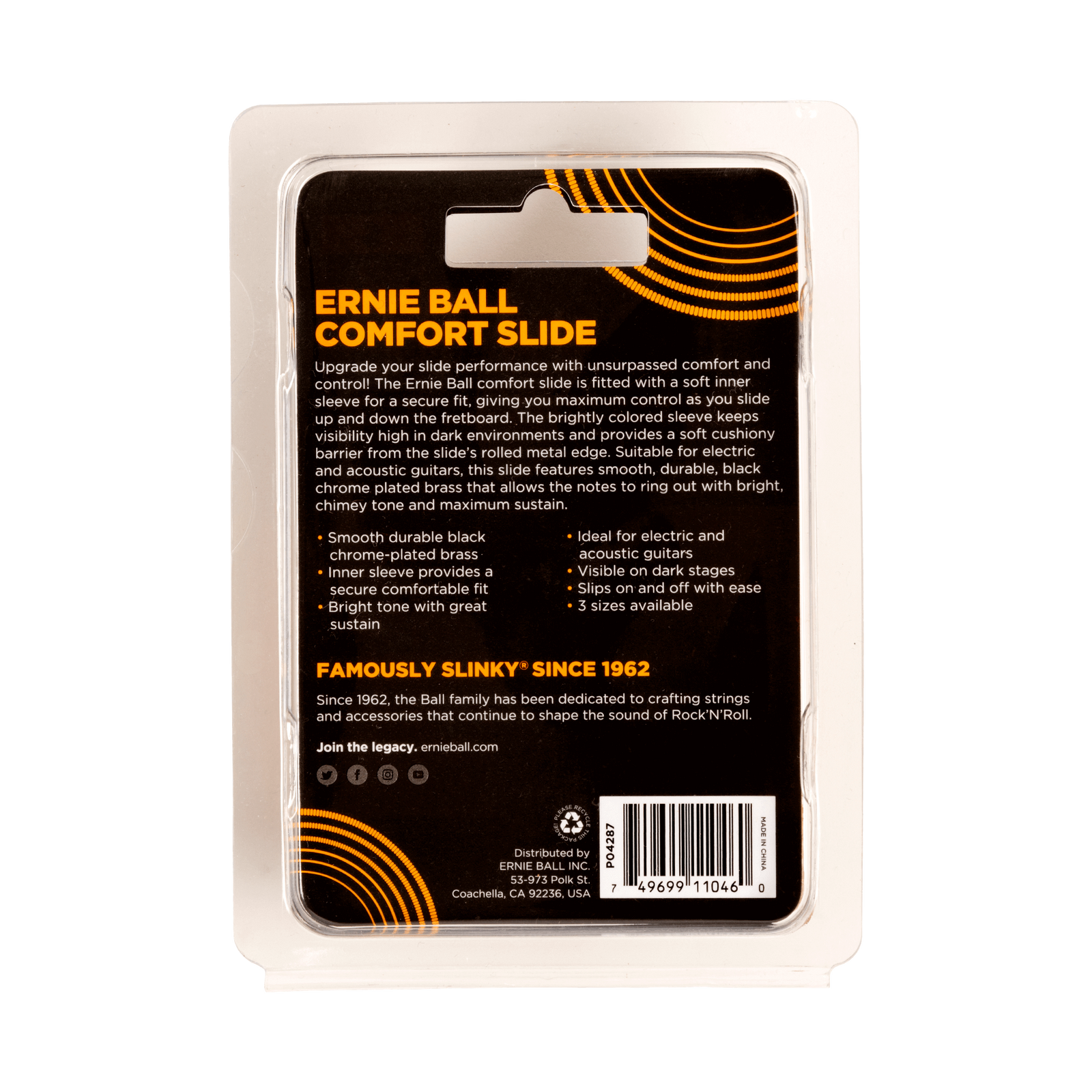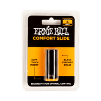 Upgrade your slide performance with unsurpassed comfort and control. The Ernie Ball comfort slide is fitted with a soft inner sleeve for a secure fit, giving you maximum control as you slide up and down the fretboard. The brightly colored sleeve keeps visibility high in dark environments and provides a soft cushiony barrier from the slides’ rolled metal edge. Suitable for electric and acoustic guitars, this slide features smooth, durable, black chrome plated brass that allows the notes to ring out with a bright, chimey tone and maximum sustain.
