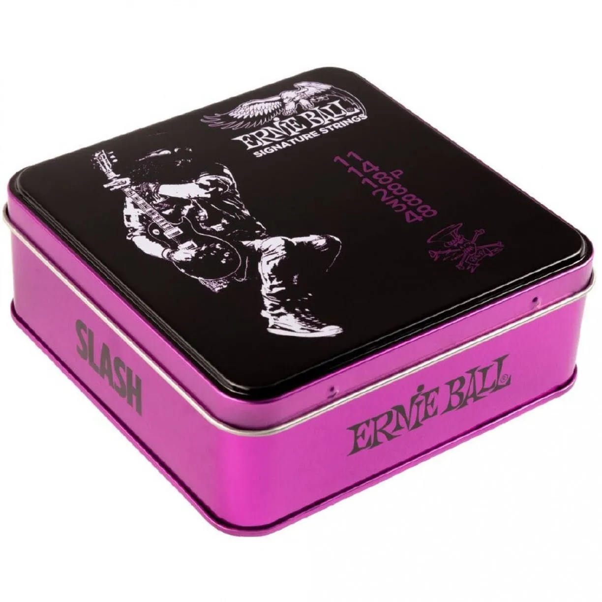 Ernie Ball introduces a limited edition set of custom wound Slash signature Slinky strings. Slash’s new signature string sets are the culmination of over three decades of Slash and Ernie Ball’s ongoing pursuit to create strings that provide more durability and tuning stability without sacrificing tone or feel. These new sets consist of his preferred 11-48 gauge Slinkys wound with Paradigm core wire and plasmaenhanced nickel-plated steel wrap wire, while the Paradigm plain strings are constructed with a heavier brass wire reinforcement at each of the ball ends for better tuning stability and strength. These limited edition string sets are highly collectible and conveniently packaged in a three-pack embossed tin box for easy storage.