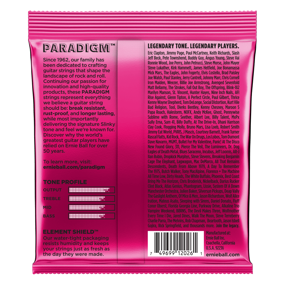 Ernie Ball Slinky Paradigm Electric guitar strings provide unprecedented strength and longer life while retaining 100% Slinky tone and feel. Ernie Ball's industry leading ultra-high strength steel is included in both the wound and plain strings along with a patented reinforcement at the ball end twist of each plain string to provide superior tensile and fatigue strength for strings that lock into tune fast and hold up under the most stressful playing styles and conditions. The coupling of Ernie Ball's Everlast nanotreatment with breakthrough plasma enhanced wrap wire provides added corrosion resistance and reduced accumulation of tone-robbing buildup and debris. Experience the first set of longer lasting strings that are worth playing with all benefits and no compromises. .009, .011, .016, .024w, .032, .042