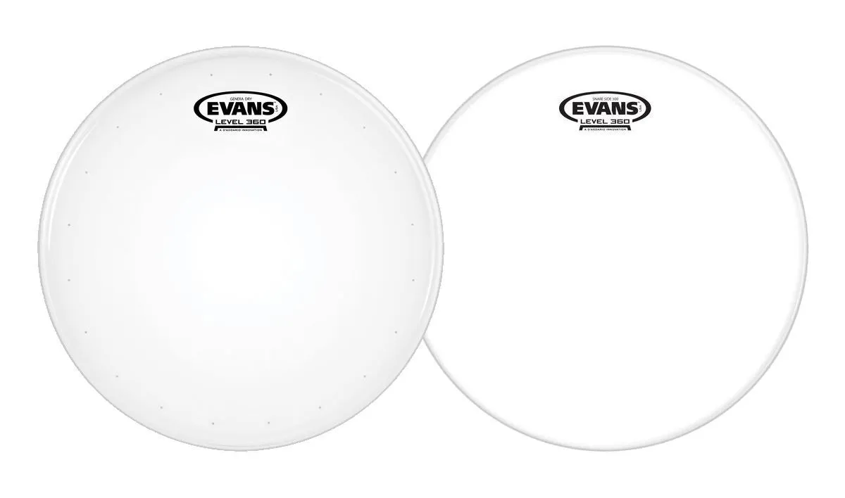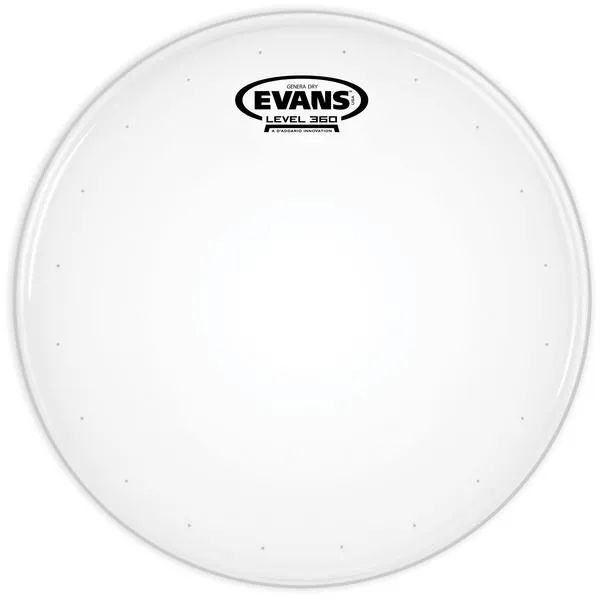 Evans Genera Dry snare heads feature a single ply of 10mil film in combination with a 2mil overtone control ring on the underside that "floats" with the head, eliminating excessive overtones and controlling sustain. Precision-drilled dry vents around the perimeter of the head further reduce overtones and sustain. Evans Level 360 technology is incorporated to extend the level playing surface of the drumhead, 360 degrees around the drum. The vertically enhanced collar design guarantees even contact with the critical bearing edge of the drum shell, resulting in: ease of tuning, extended pitch range and optimum quality of sound. Evans Level 360 technology resolves the age-old dilemma of traditional synthetic heads consistently not fitting the drum shell without using considerable force.