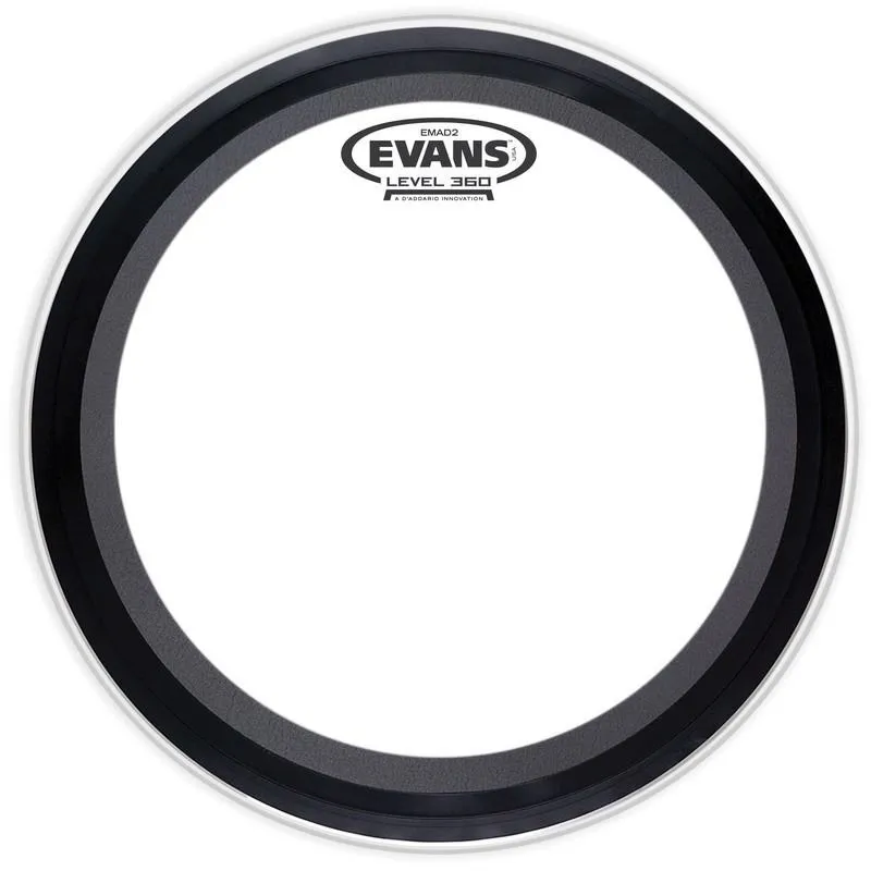 Evans EMAD2 series features two plies of film. The outer ply of 6.5mil and an inner ply of 10mil film provides an enhanced attack, focus and durability. The EMAD2 contains two interchangeable damping rings that maximize attack and low-end without removing the head or reaching inside the drum. The unparalleled industry standard Externally Mounted Adjustable Damping (EMAD) system allows the player to adjust attack and focus.