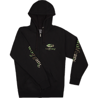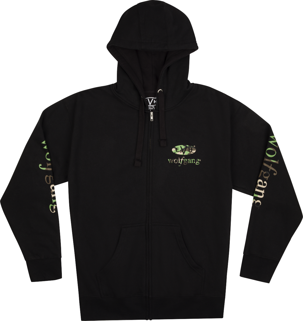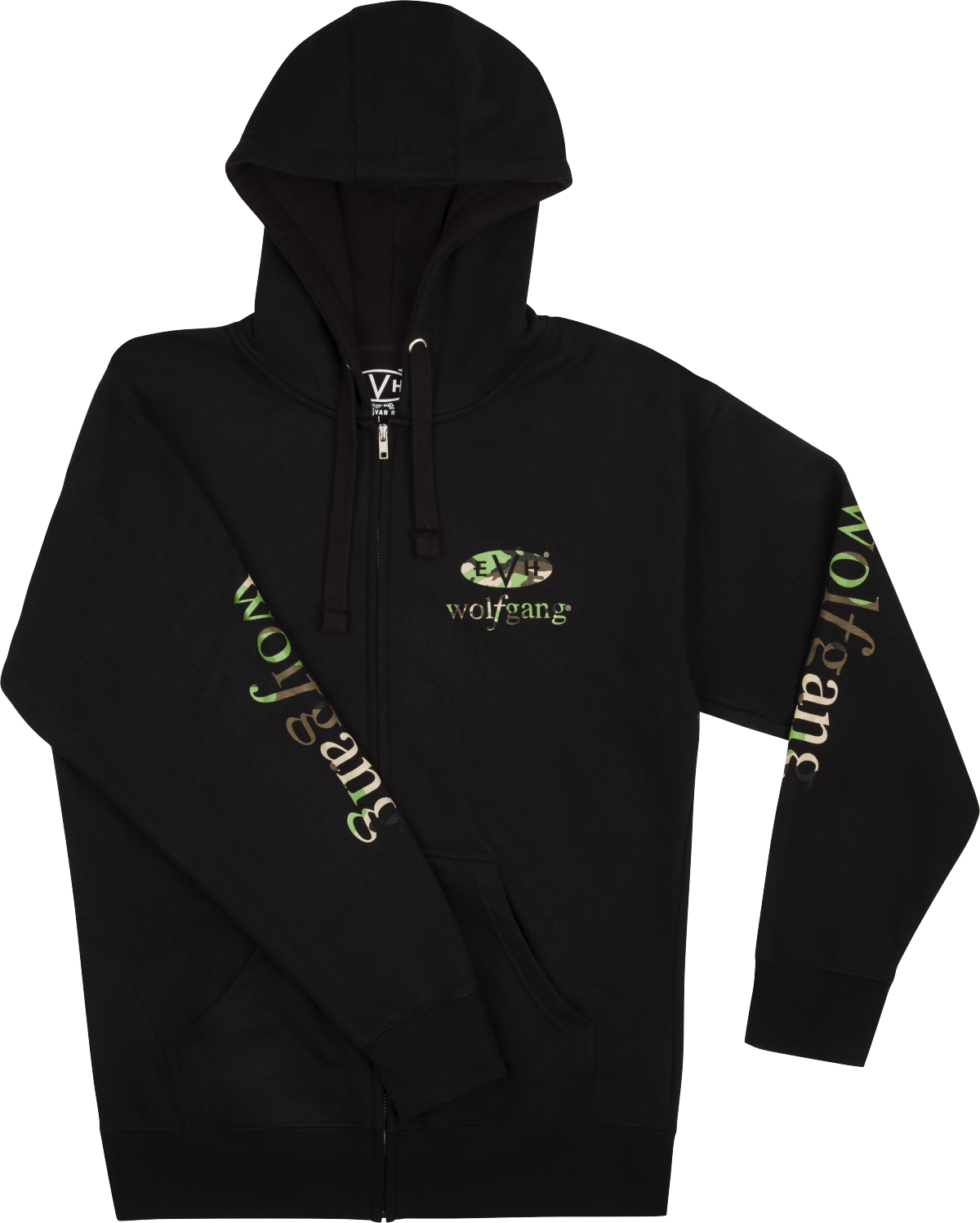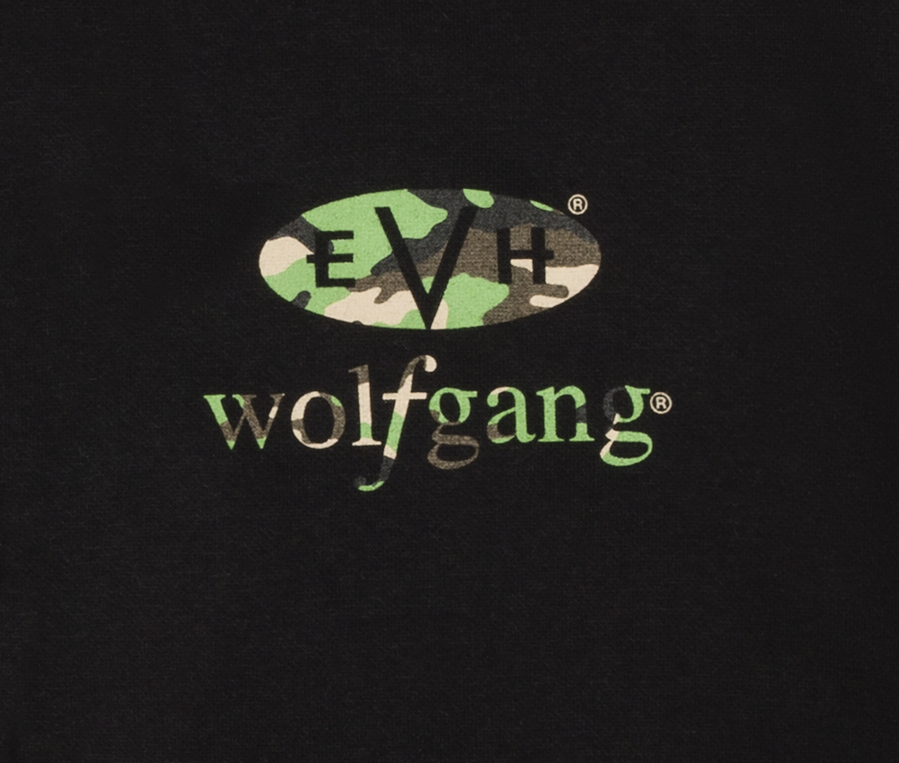 Show your love for EVH® with this new Wolfgang™ Black and Camo hoodie! It features a zip up front, camo logos and a drawstring hood. The perfect gift for yourself, or any EVH® fan! Pad printed neck tag. Available in sizes S-XXL