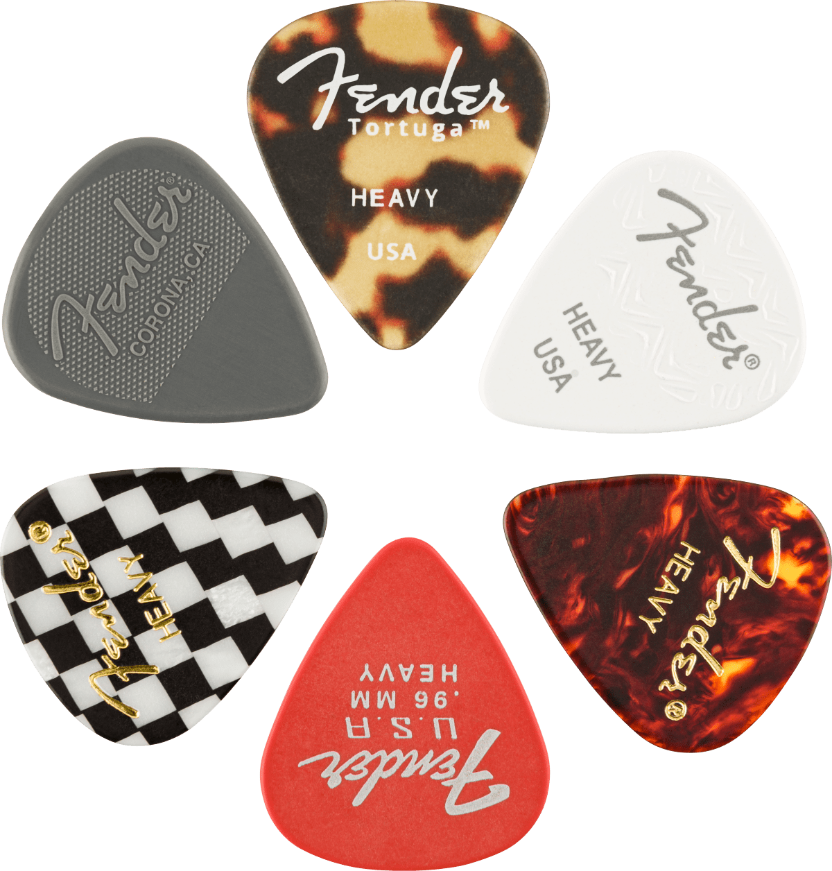 The traditional 351 shape, our most popular pick design, is a perfect accessory for players of versatile styles and techniques. This six-pack of picks contains one crafted from various Fender materials: Celluloid, Tortuga, Nylon and Dura-Tone™, along with a Wavelength™ pick.