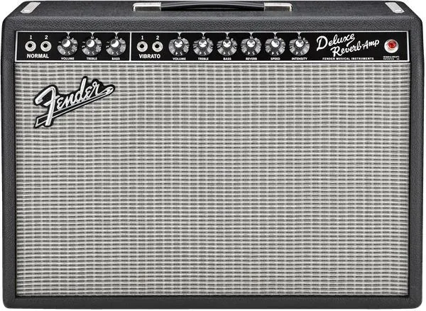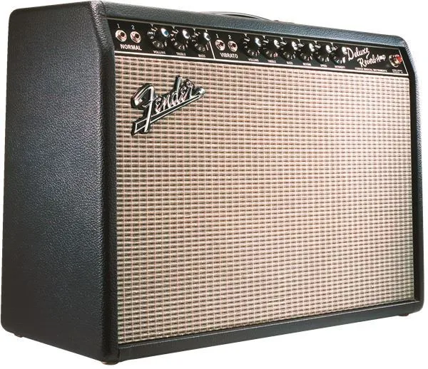 The 22-watt '65 Deluxe Reverb® amp is for rock, country or blues players who want a moderately powered amp they can crank up at the gig or in the studio. The full, snappy guitar tones heard on many famous recordings from Memphis to Abbey Road were made using the Deluxe™ amp. Features include dual 6V6 Groove Tubes® output tubes, one 5AR4 rectifier tube, four 12AX7 preamp tubes, two 12AT7 tubes, one 12" 8-ohm Jensen® C-12K speaker, dual channels (normal and vibrato), tube-driven Fender® reverb, tube vibrato, two-button footswitch for reverb and vibrato on-off, black textured vinyl covering and silver grille cloth.