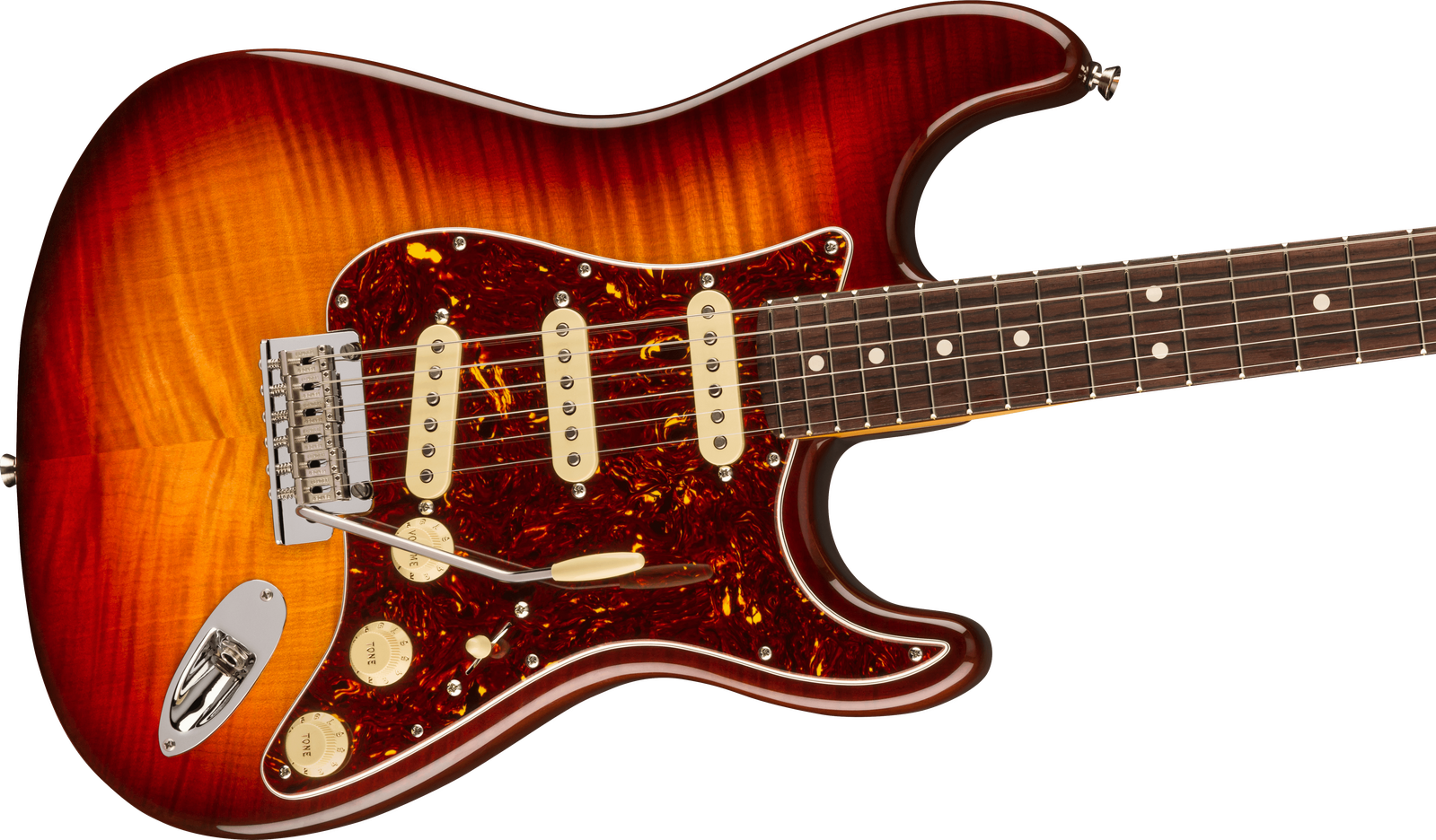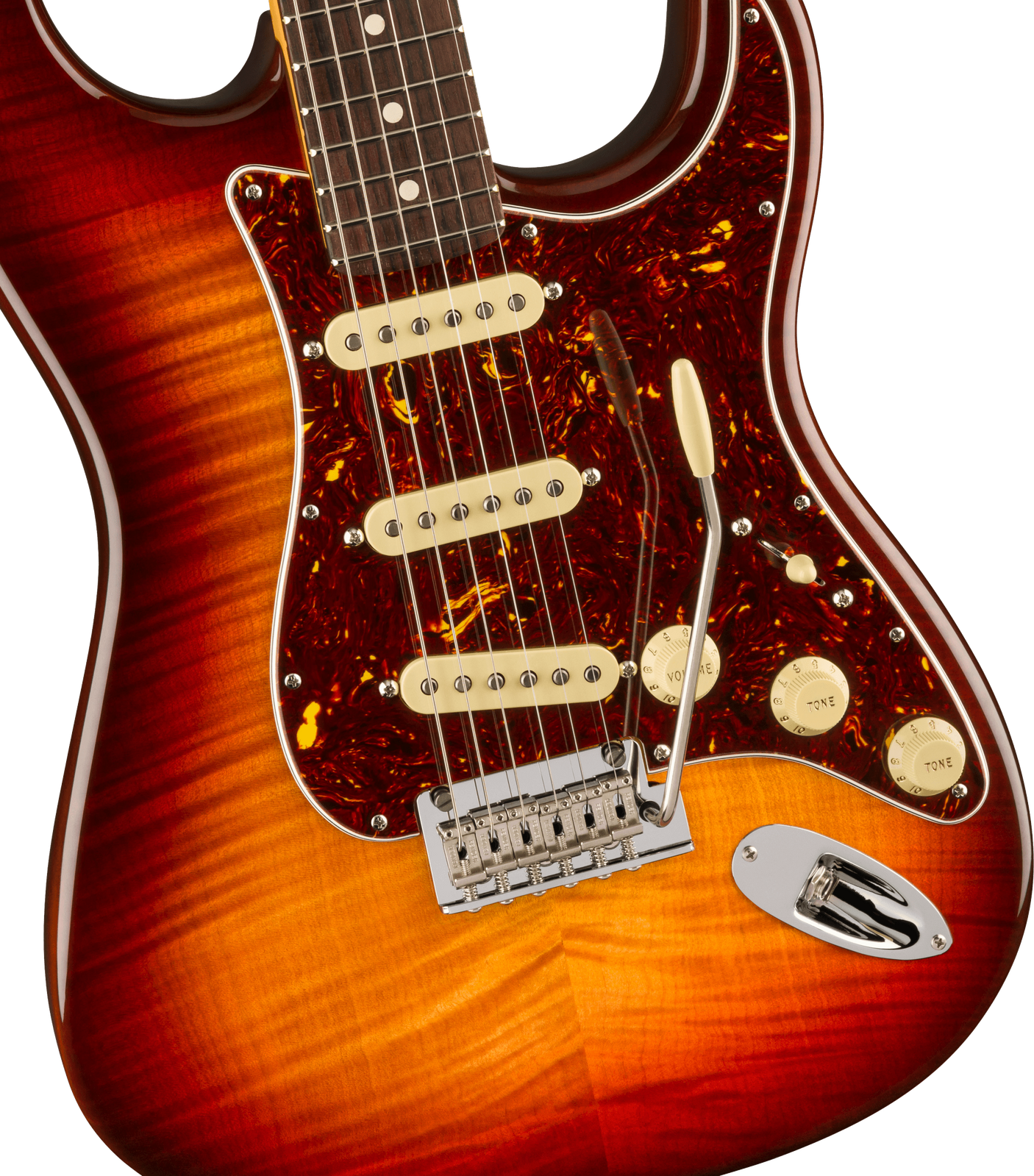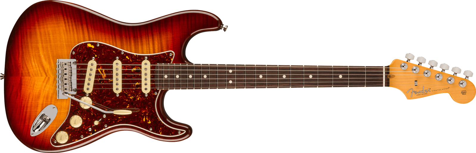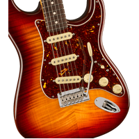 Take your playing to new heights with the 70th Anniversary American Professional II Stratocaster. The alder body, stunning flame maple top and Comet Burst finish exude elegance and class. Equipped with 70th Anniversary V-Mod II Single-Coil Strat® pickups, this guitar delivers dynamic and expressive tones. The Deep "C" neck features smooth rolled fingerboard edges, "Super-Natural" satin finish and sculpted neck heel for a supremely comfortable feel and easy access to the upper register. An upgraded 2-point tremolo with a cold-rolled steel block increases sustain, clarity and high-end sparkle. Deluxe locking tuners ensure exceptional tuning stability. The American Pro II Stratocaster delivers instant familiarity and sonic versatility you'll feel and hear right away, with broad ranging appointments that add up to nothing less than a new standard for professional instruments. The Inca Silver ABS molded case provides reliable protection for your prized instrument.