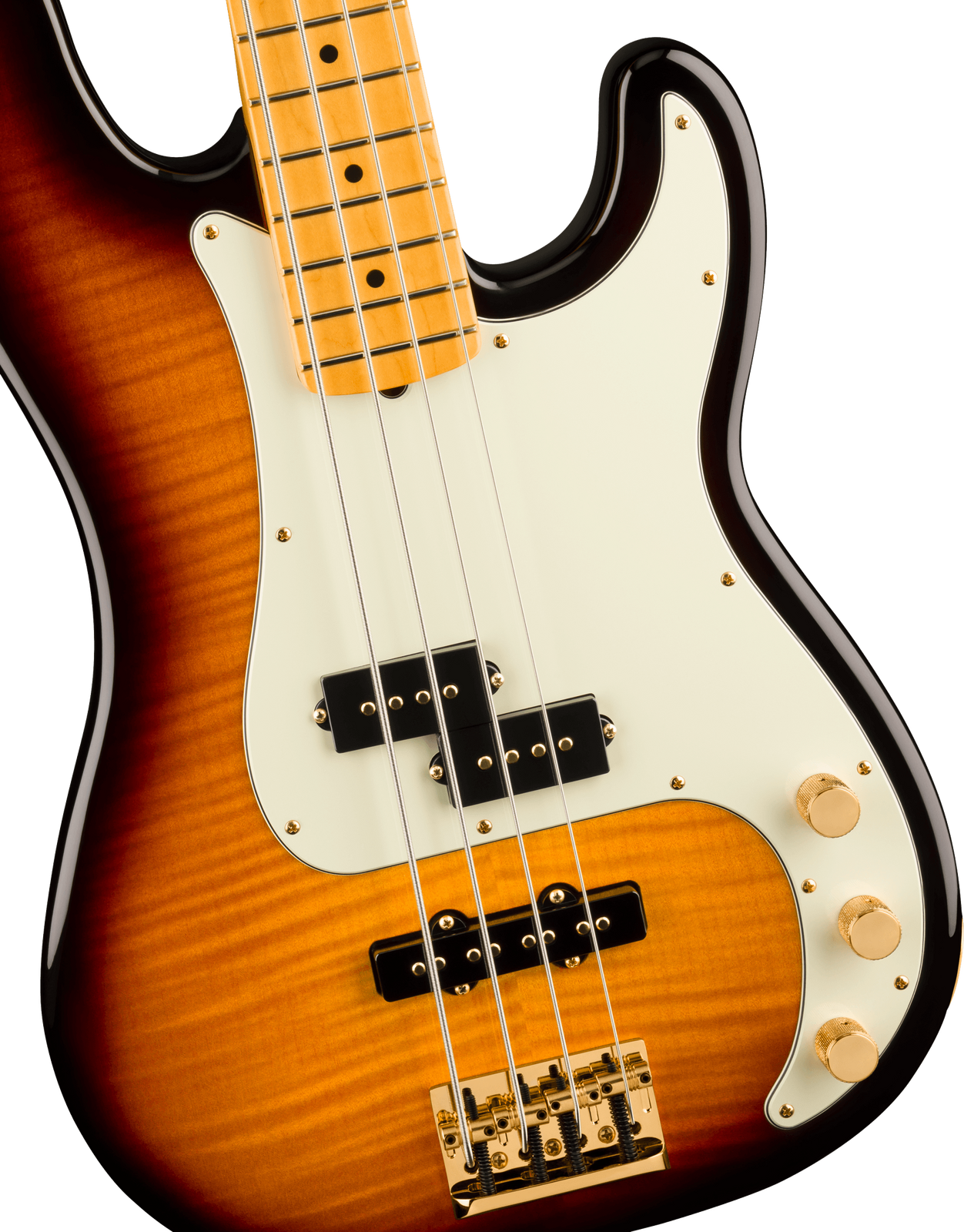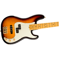 Celebrate 75 years of bass innovation with the 75th Anniversary American Professional PJ Bass. Crafted with a resonant alder body topped with a stunning flame maple top and finished in a classic 2-tone sunburst, this instrument radiates premium elegance. The Modern "C" shaped maple neck with 9.5" radius maple fingerboard and medium jumbo frets provide the smooth, fast playability that today's players demand. The 75th Anniversary Precision Bass® and Jazz Bass® pickups deliver the best of both worlds - that foundational P-Bass thump combined with the articulate growl and versatility of a J-Bass bridge pickup. Other premium appointments include gold-plated hardware throughout, a vintage HiMass™ bridge and tapered-shaft tuning machines. This limited-edition model represents the evolution of the Precision Bass legacy, a must-have for collectors and bass enthusiasts seeking modern performance.