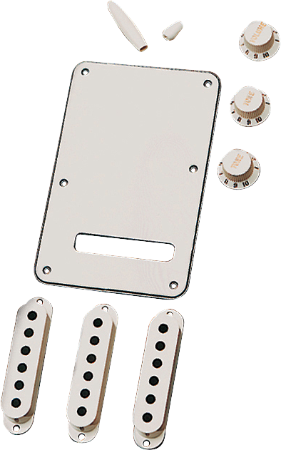 Change the look of your Stratocaster easily and affordably with a Stratocaster Accessory Kit. Contains volume and tone control knobs, pickup switch tip and tremolo arm tip, tremolo backplate and pickup covers (pickup covers do not fit SCN™, N3™ and Noiseless™ pickups).