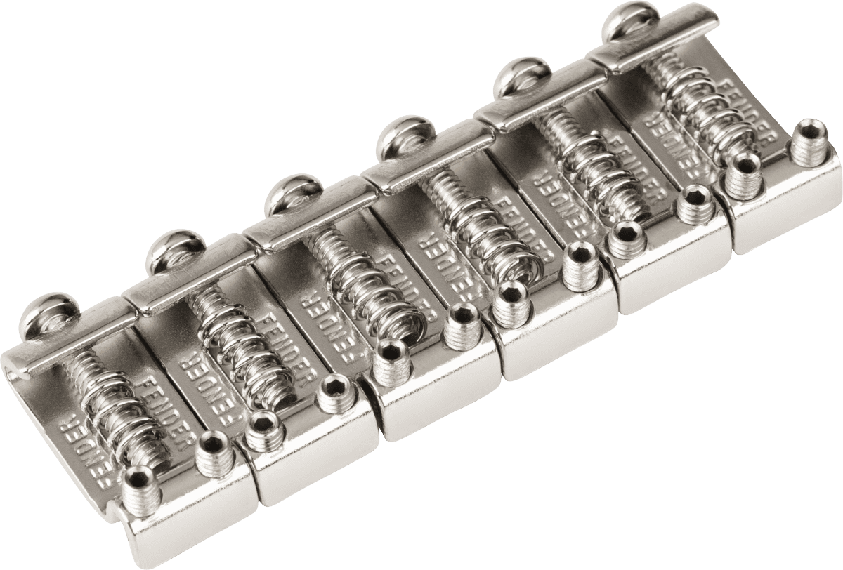 Bridge saddle kit used on 2008 American Standard Stratocaster® made of bent steel with nickel finish. Fender stamped with "FENDER" and include height adjustemnt screws and intonation screws with springs. String spacing: 2 1/16".