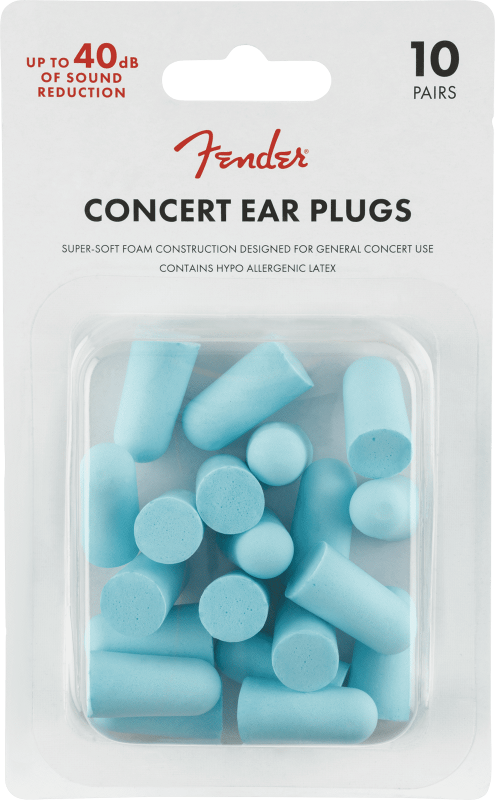 Fender Concert series ear plugs protect your hearing during concerts, festivals and other high-volume events. Featuring 10 pairs of Daphne Blue foam plugs, this pack is perfect for general concert and band practice use. Designed with a 32-decibel noise-reduction rating for maximum protection and noise attenuation, and super-soft disposable foam for a comfortable and customized fit.