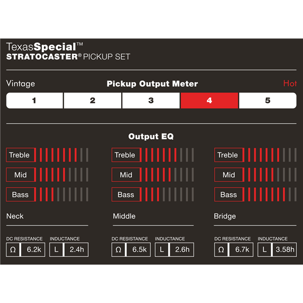 The pickup that redefined hot Texas blues tone. Custom Shop Texas Special Stratocaster pickups are over-wound for increased output, and are made with alnico 5 magnets and enamel-coated magnet wire for great midrange bite with crystalline highs and tight bass.