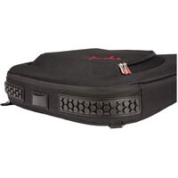 Fender's F1225 Series gig bag is the ultimate choice to keep your electric guitar safe while traveling. Featuring our iconic asymmetrical instrument shape, its durable outer layer is constructed of tough 1200 Denier polyester that protects against impacts without ripping and tearing. Its interior is filled with 25mm padding lined with soft touch microfiber that keeps your instrument secure while avoiding finish damage. It even comes with two adjustable protective neck rests and exterior bumpers to minimize any strain on the instrument while in transit. The F1225 gig bag also comes with a super-padded handle and shock-absorbing EVA padded backpack straps with easily adjustable ladder lock buckles, so you can carry your instrument without physical strain. Plus, it features plenty of storage space with its large front pocket and zippered backpack strap pocket. The front storage pocket offers space for small accessories and has two dedicated pockets for extra strings, a removable padded tool pouch, three elastic pick pockets, two elastic pen loops, key fob hook and a business card window.