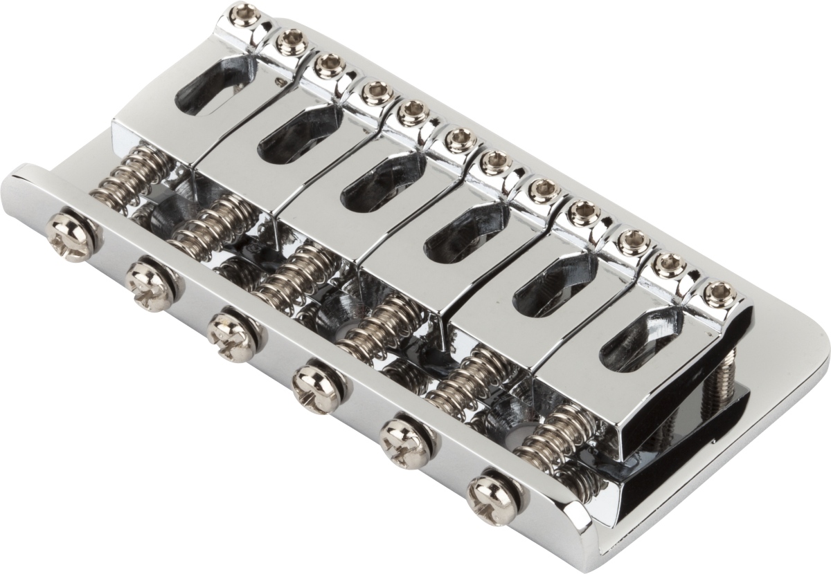Chrome-plated hardtail strings-thru-body bridge assembly with six block-style saddles, intonation screws, springs, and saddle height adjustment screws. Does not include bridge mounting screws.