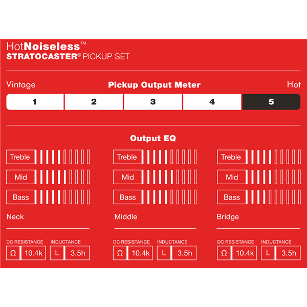 Fender Hot Noiseless Strat pickups exude tone that combines warmth and punch with cutting bluesy articulation, with a screaming high-gain bridge pickup. And thanks to Fender's state-of-the-art Noiseless design, the clean, full sound is free of hum.