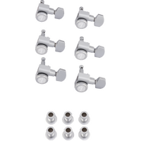 Set of six locking tuners designed to fit most modern-style Fender electric guitars with dual-pin mounting configuration. Tall post tuners are used for the wound strings and shorter post tuners are used for the plain strings. Staggered tuners increase the break angle over the nut and improve tuning stability.