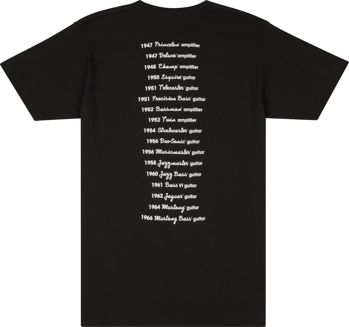 We honor our iconic past with a classic Fender transition logo and a tribute to milestone guitar and amp releases spanning from 1947 to 1966. This collection builds on our top-selling apparel, expanding the brand in bold, authentic ways. The tee flexes our iconic logo up front and legendary gear release dates from 1947 to 1966 on the back — a timeline of tone that changed music forever. Vintage feel, modern edge. Wear the legacy loud!