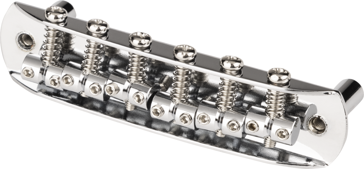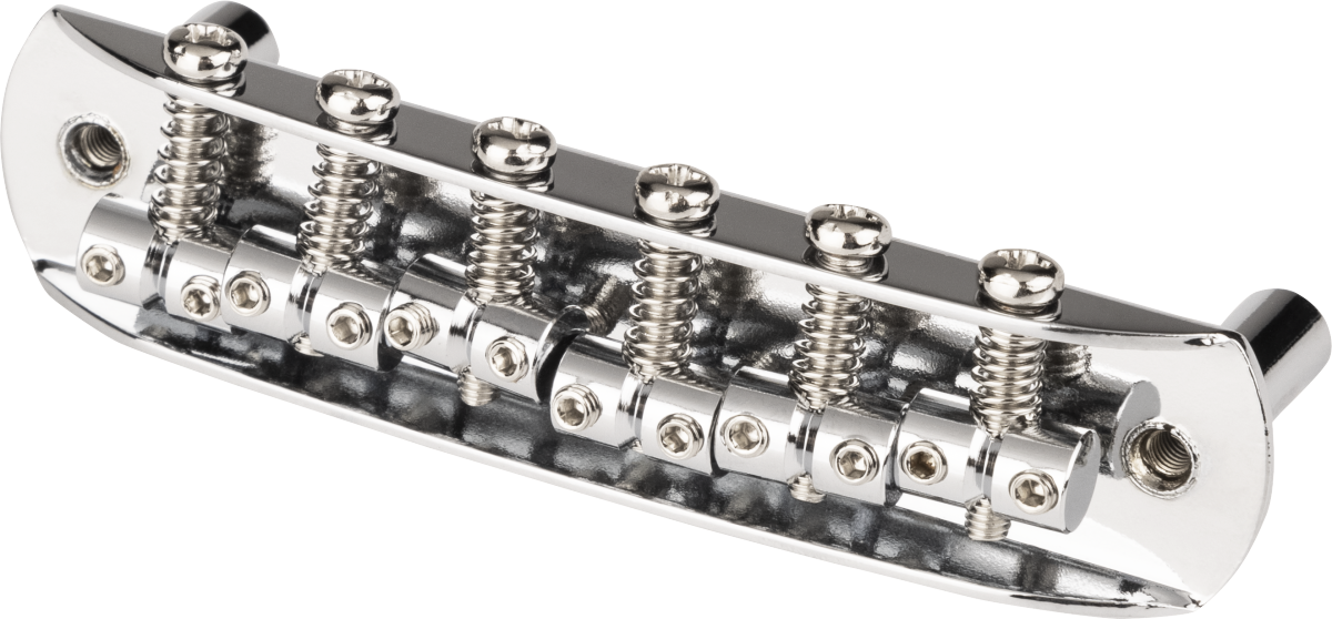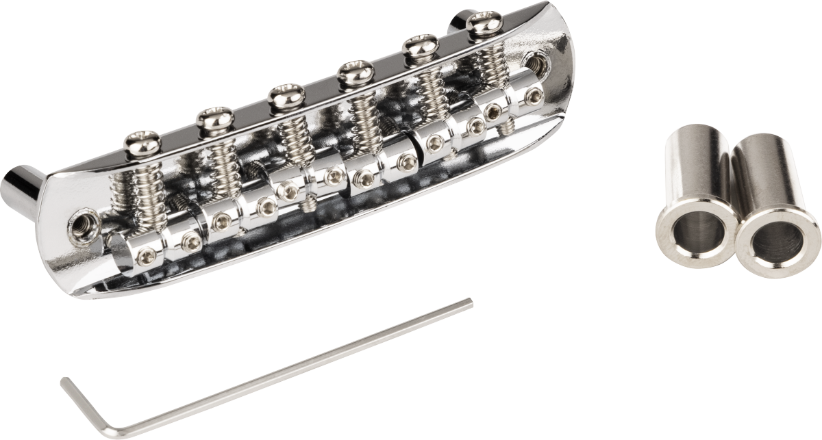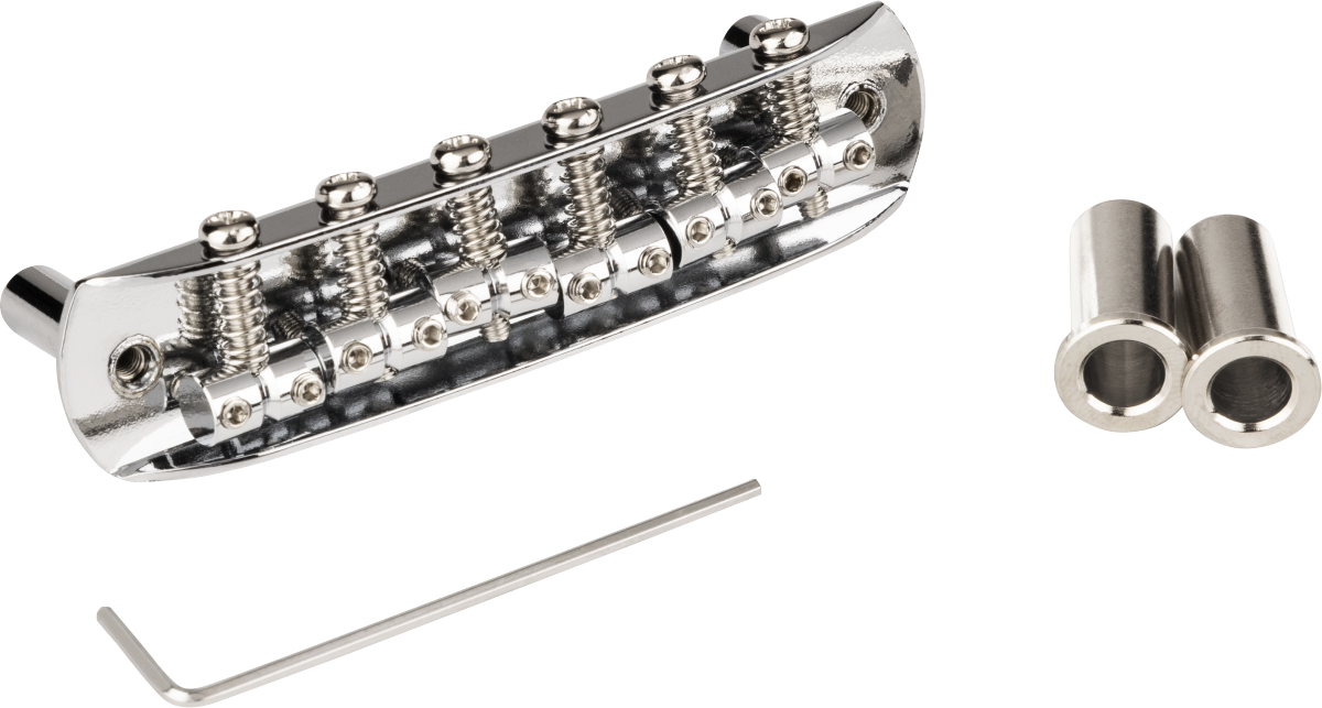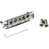 Chrome-plated bridge assembly includes six fully adjustable saddles, six intonation screws and springs, and two mounting posts with adjustable allen screws. Does not include "thimble" posts that fit into guitar body. String spacing is 2.20" (55.88 MM)