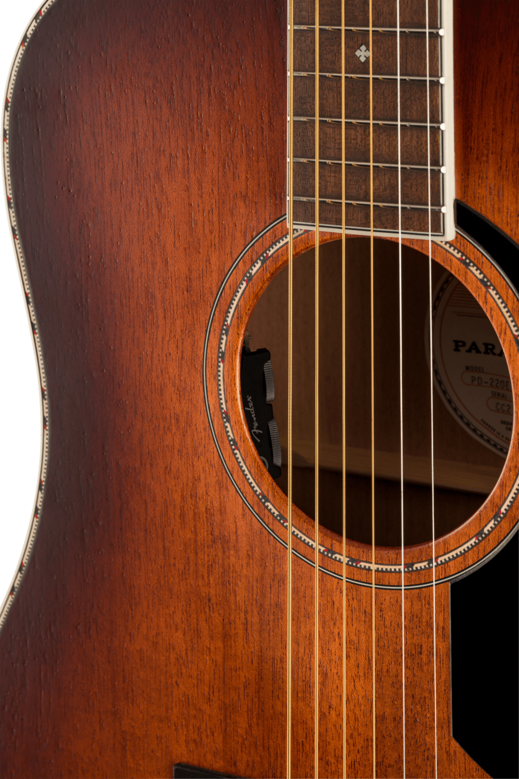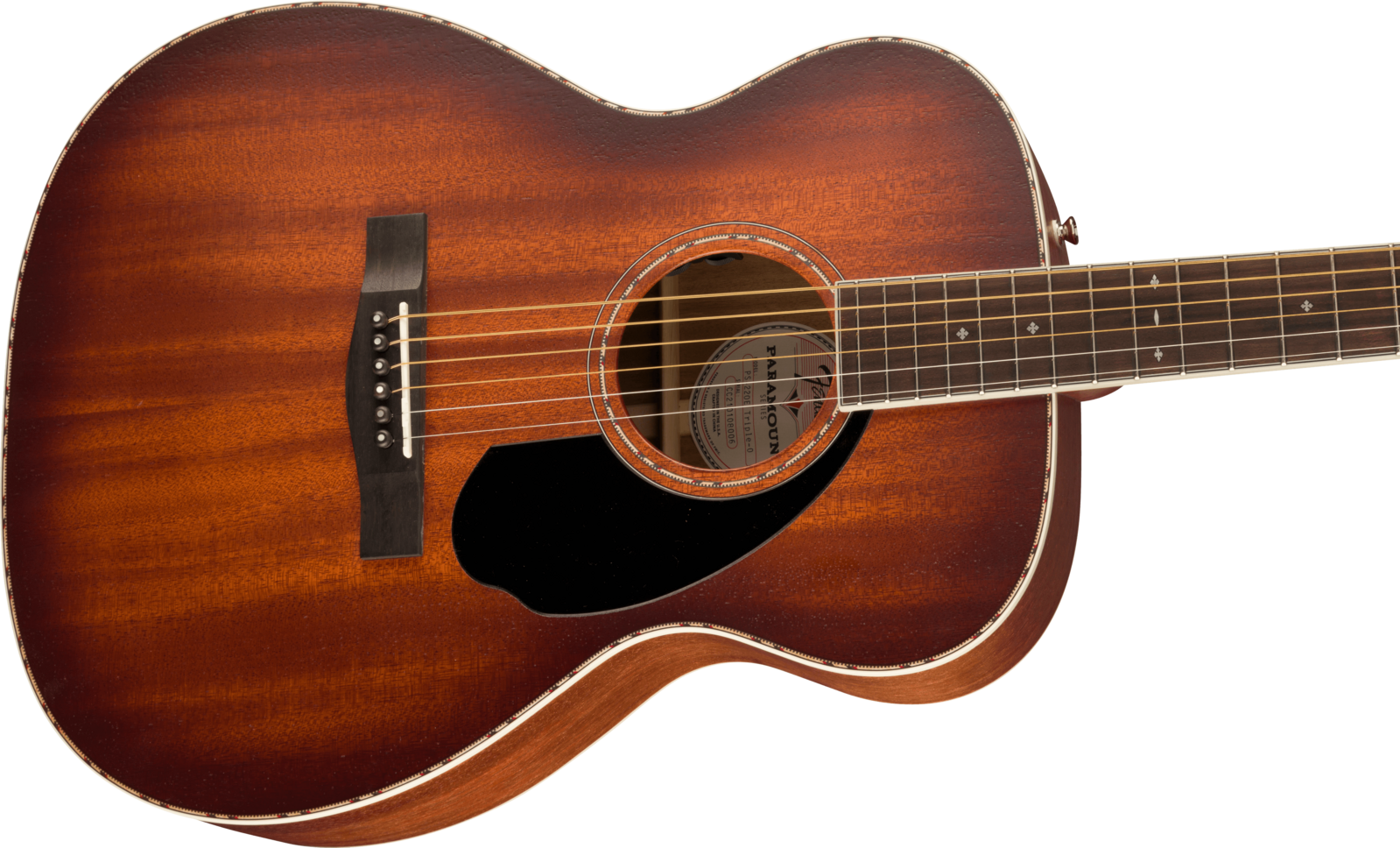 The Paramount PO-220E combines state-of-the-art craftsmanship with vintage-inspired appointments, delivering the best of both worlds. Built with the choice of a solid spruce or solid mahogany top paired with solid mahogany back and sides, the PO-220E features an offset X-bracing pattern that has been carefully refined to optimize resonance and tone. A Fender and Fishman®-designed pickup amplifies the warm, mid-focused tone of the PO-220E’s newly designed orchestra body shape, while the soundhole-mounted controls preserve the vintage aesthetics. Under the top, a body-sensing pickup enhances the soundboard's vibrations which can then be blended with the undersaddle Sonicore pickup.