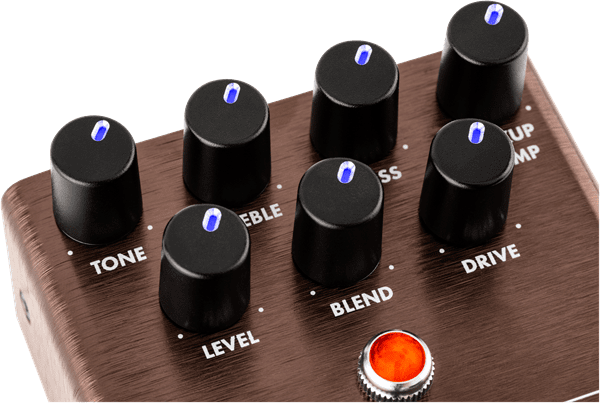 Designed by our in-house team of experts, the Smolder Acoustic Overdrive is an all-original Fender circuit. The chassis is crafted from lightweight, durable anodized aluminum, and the Amp Jewel LED gives your pedalboard the classic Fender look. The switchable LED-backlit knobs show your control settings on a dark stage at a glance.