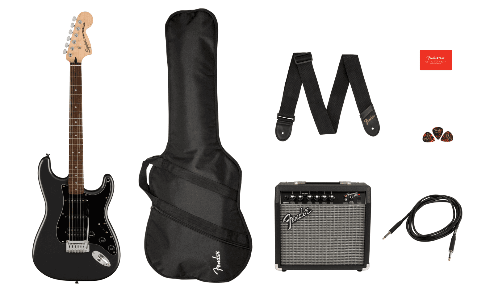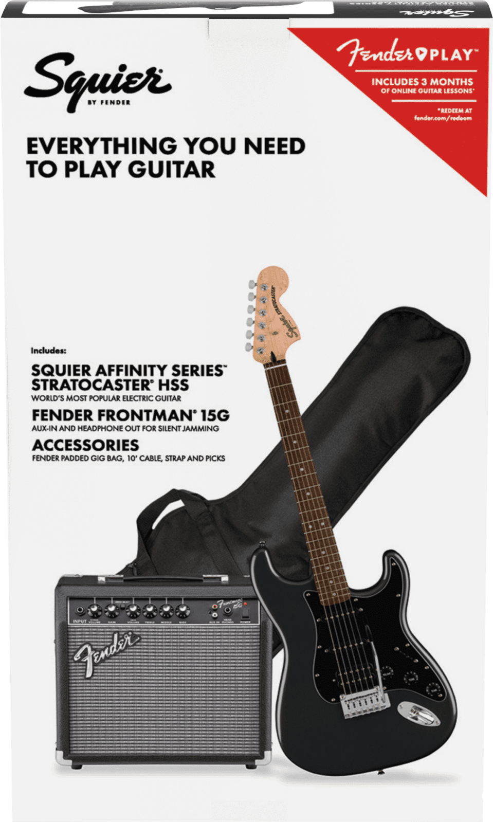 • Includes Fender Frontman® 15G Amplifier, Fender Padded Gig Bag, Fender Guitar Strap, Fender 10' Instrument Cable, Fender Guitar Picks, & 3-Month Fender Play™ Subscription