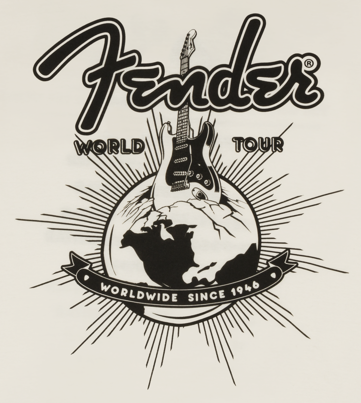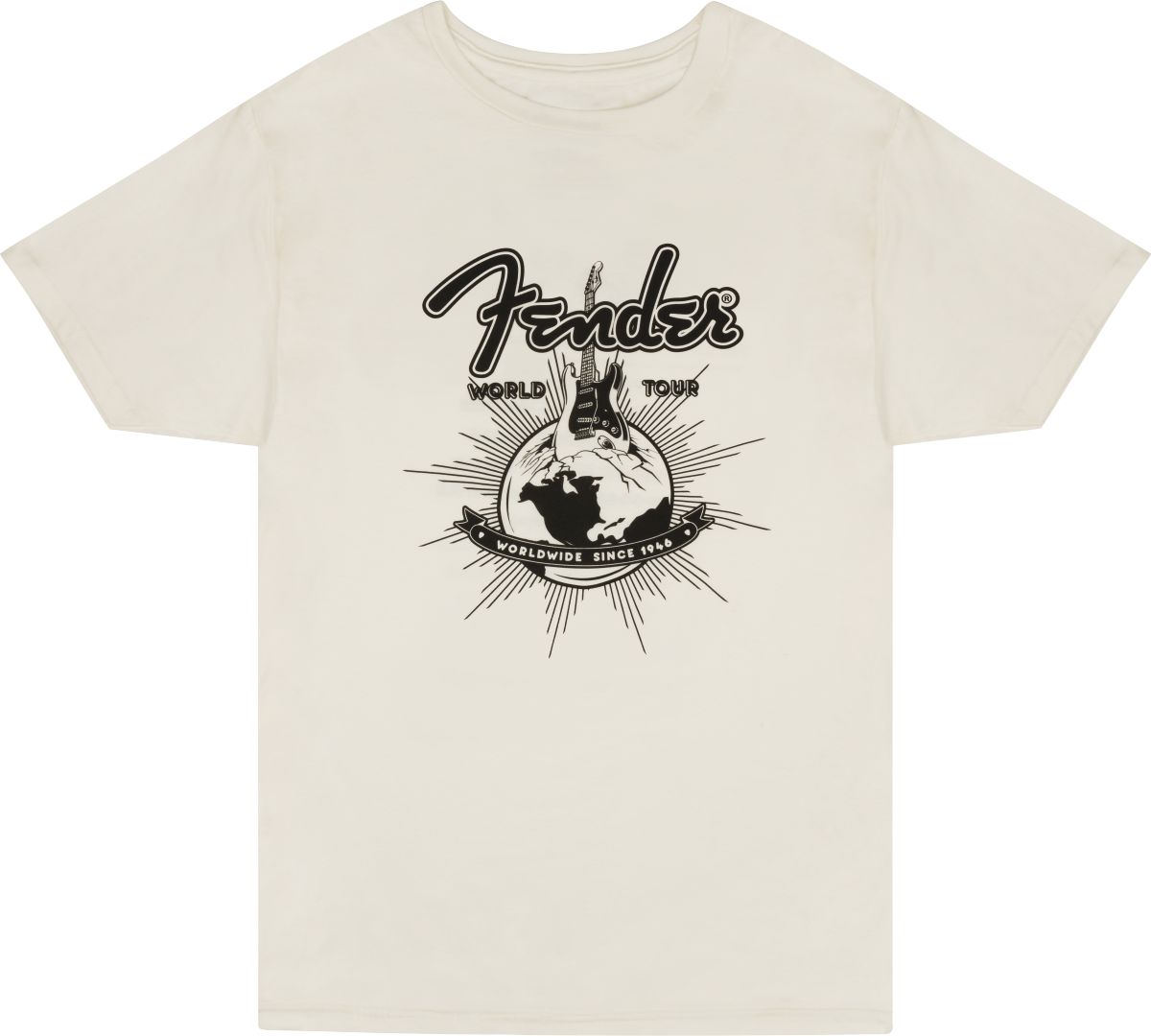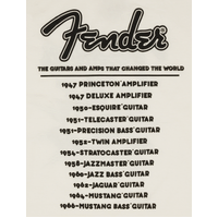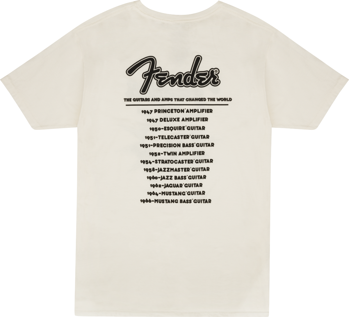 Fender's® world tour is about to begin with this throwback tour t-shirt. In vintage white, with iconic Fender® release dates on the back you will feel part of our rich legacy. Starting in 1947 with the release date of our famous Princeton® classic tweed amplifier and ending the tour in 1966 with the release date of our celebrated 1964 Mustang® bass guitar. What a journey it has been!