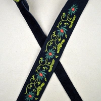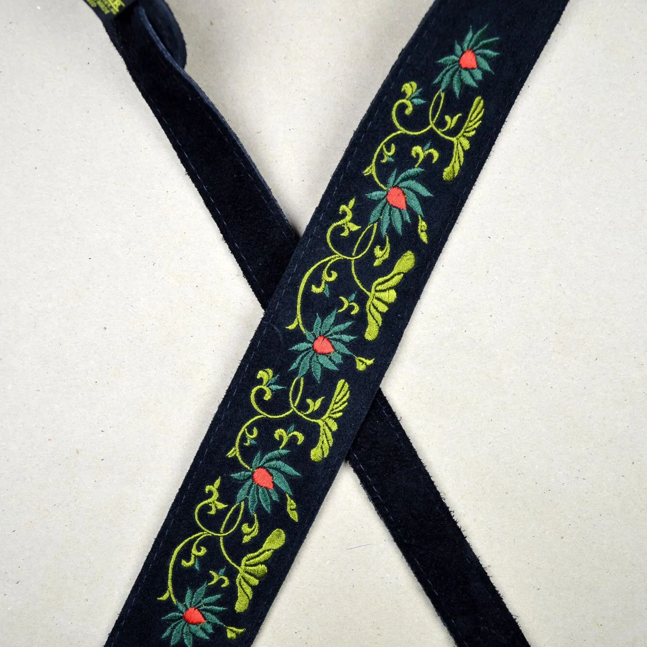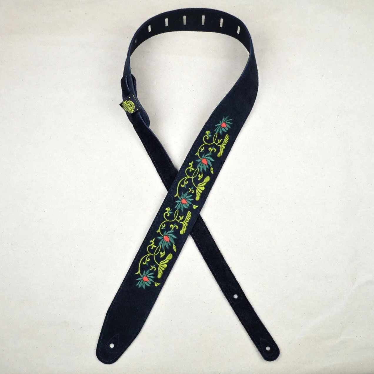 Flower and Leaves Embroidered Black Suede Guitar Strap