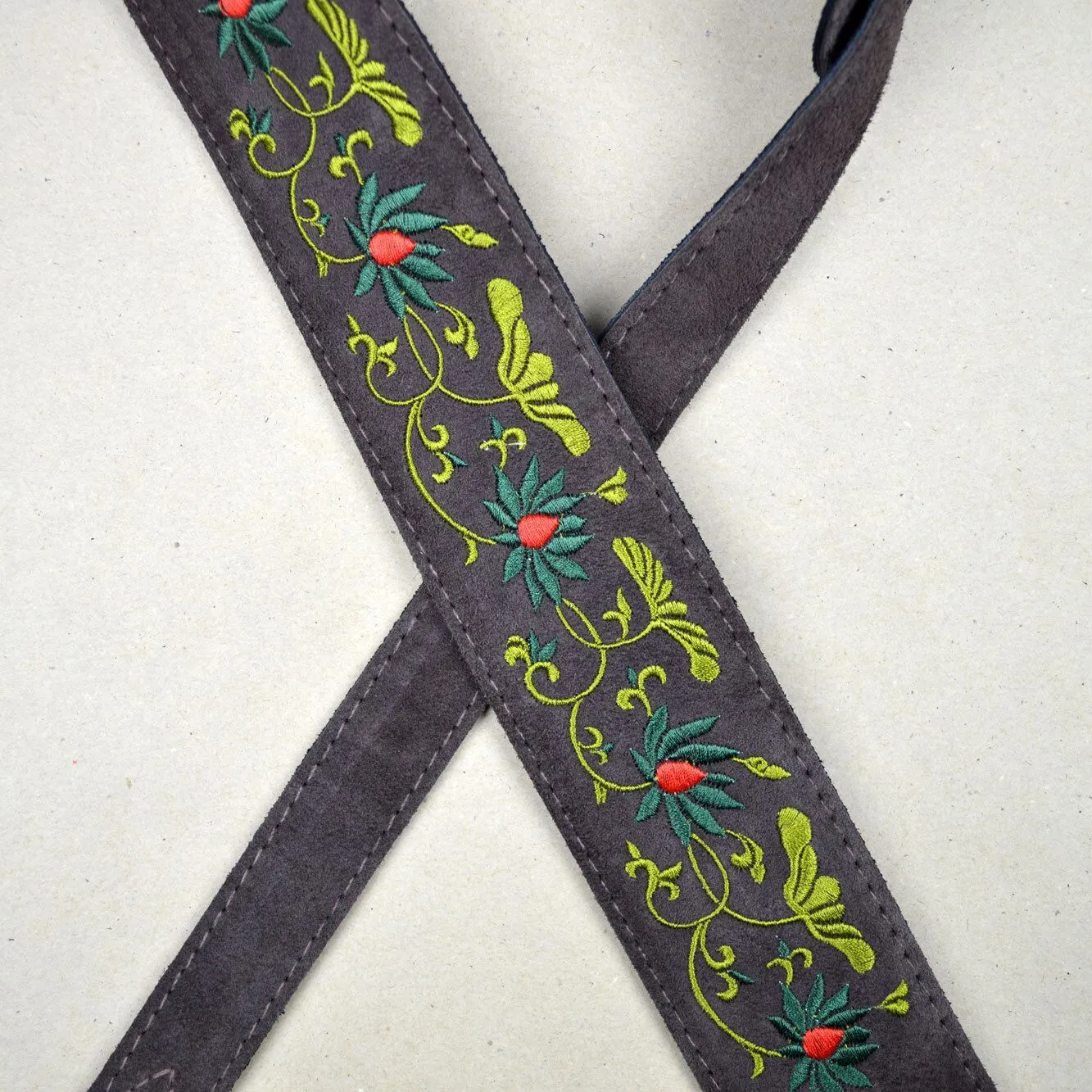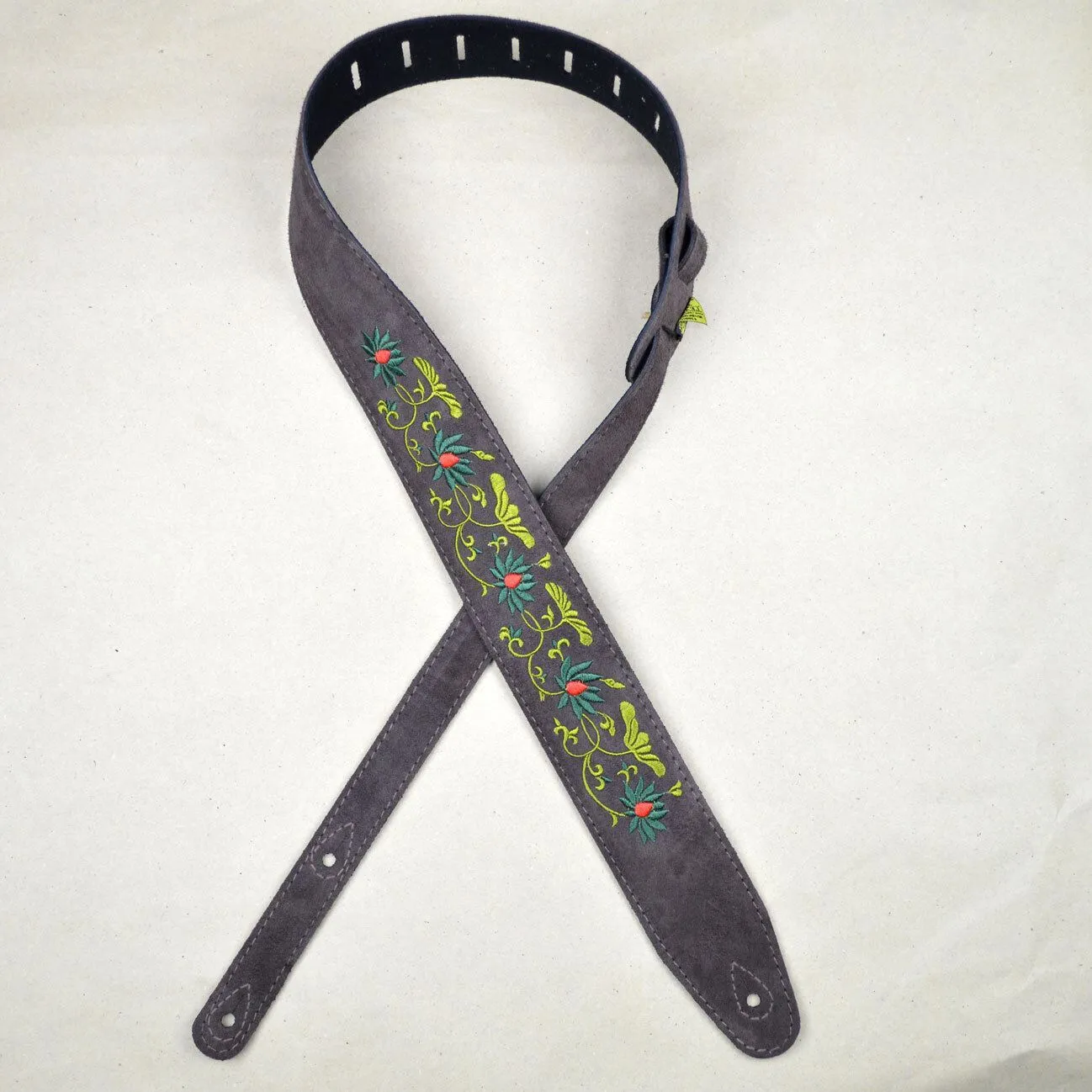 Flower and Leaves Embroidered Brown Suede Guitar Strap