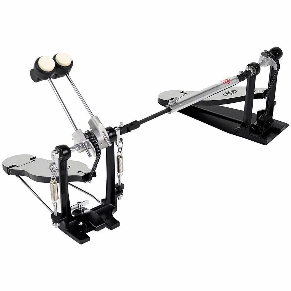 This lightweight single-chain drive double pedal offers a swift and solid feel. Its smooth G-Styled footboards and heel plates offer a sleek look and are great for players who like to slide their feet on the footboard. Its sturdy all-cast metal frame provides stability and a solid mounting to the bass drum hoop. The adjustable connector drive, easy-to-access tension adjustment, and two dual-surface bass drum beaters make this pedal a contender for all players