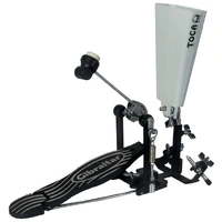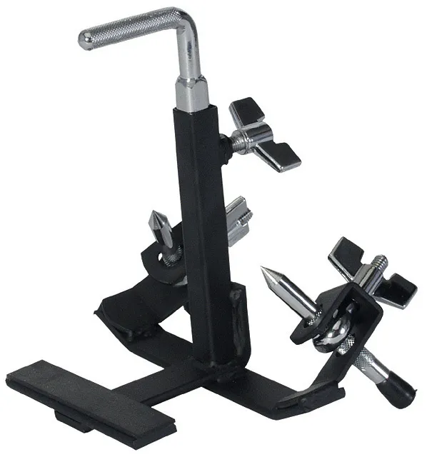 Mounts cowbells, blocks or tambourines to an adjustable floor stand which accepts most bass drum pedals.