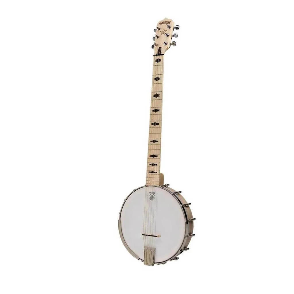 This is a 6 string, steel string banjo that tunes as a guitar, and that's built with a fast, sleek, comfortable guitar-style neck that already feels like an old friend. The Goodtime 6 has an 11 inch 3-ply violin grade maple rim with a frosted top head lending that traditional banjo snap. The addition of a piezo pickup that sits directly under the bridge makes for immediate ease recording and going out onstage.