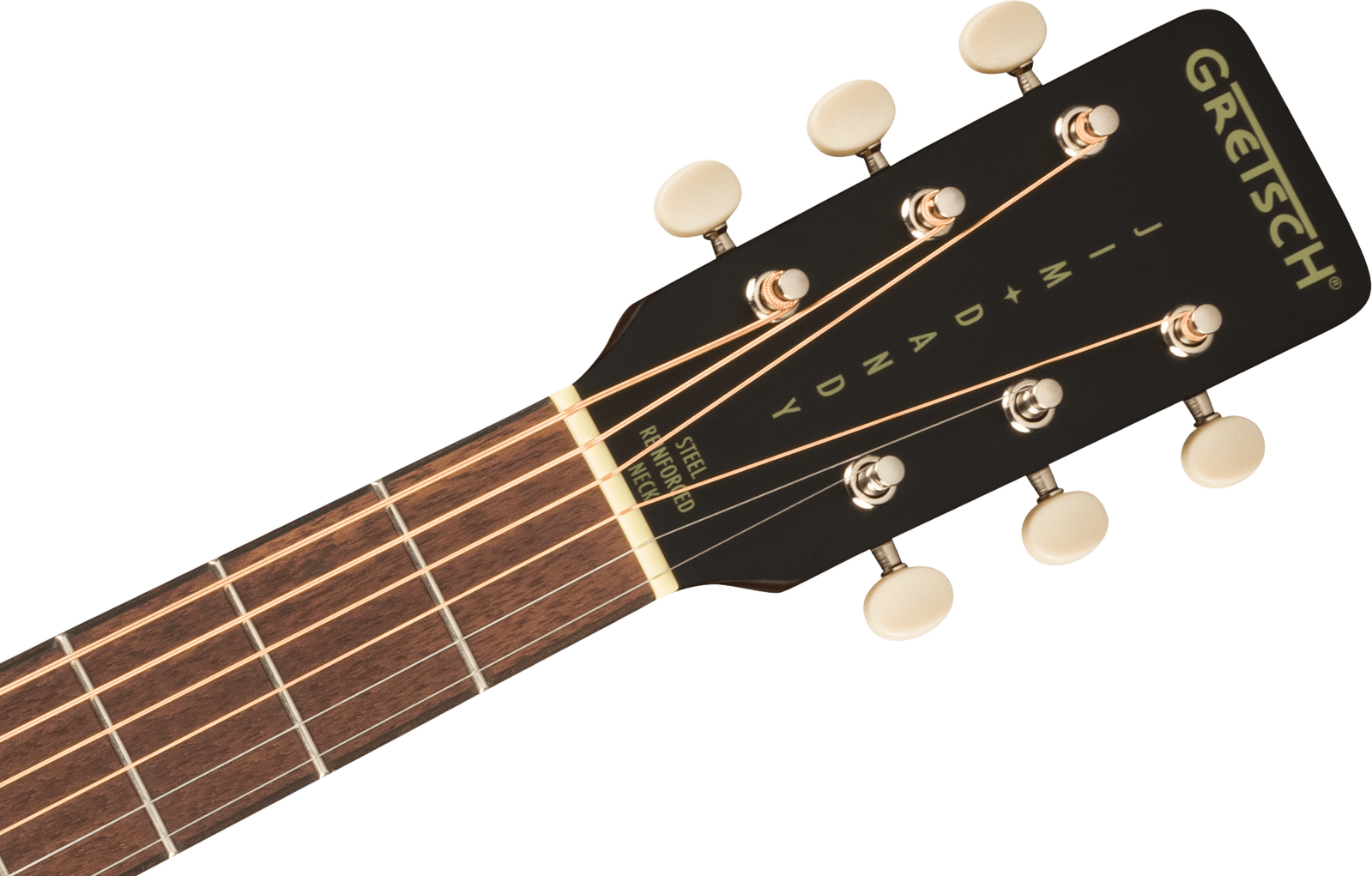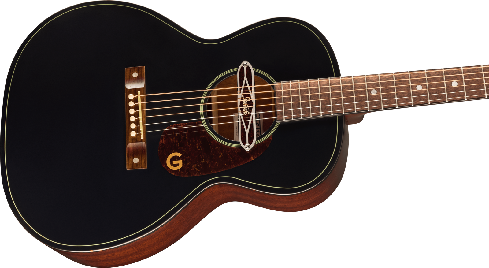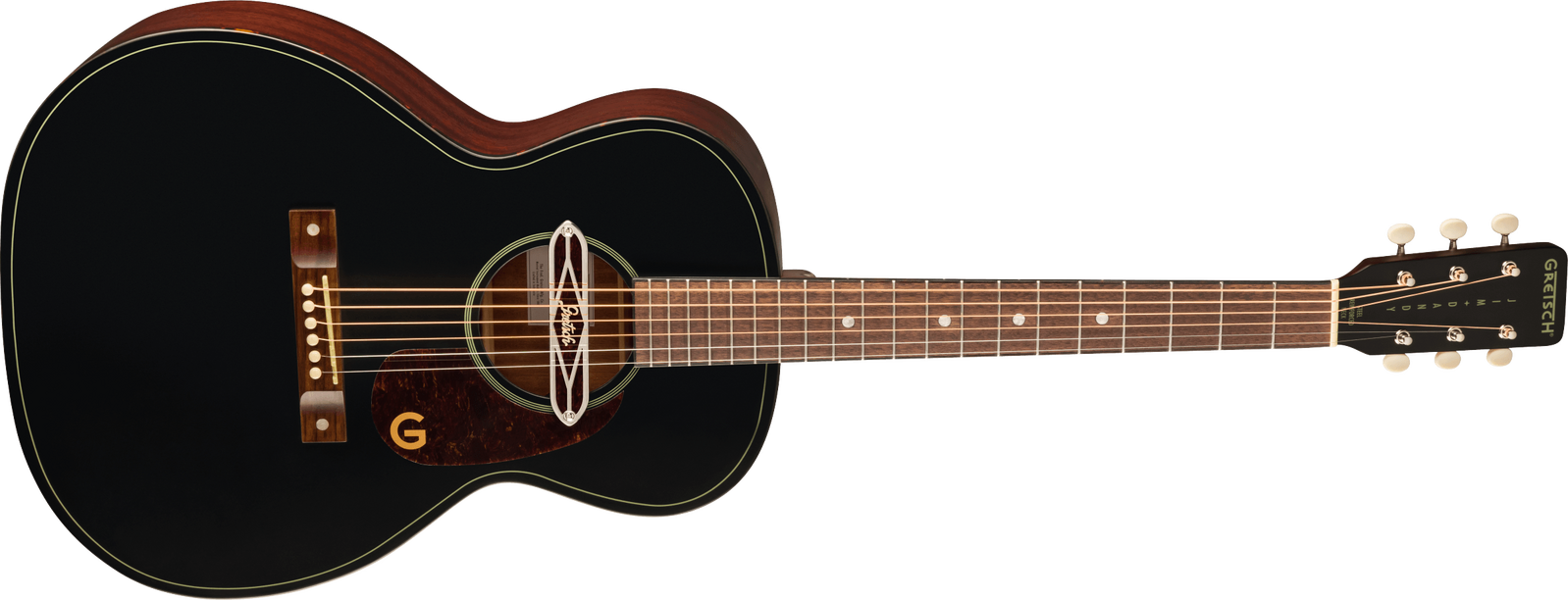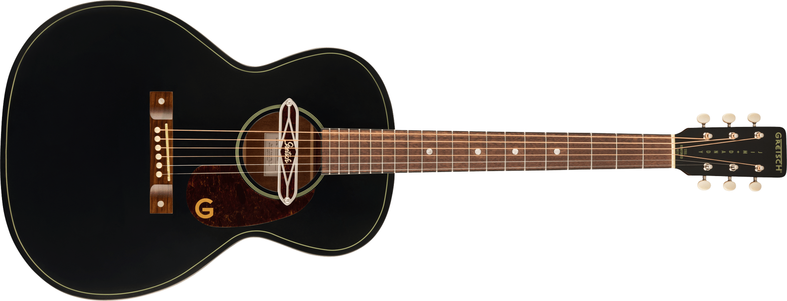 The X-braced body is crafted with select lightweight laminate tonewoods for an optimal balance of woody vintage tone and reliable durability, while the “C”-shape neck presents an inviting feel for hours of old-timey inspiration. The onboard Gretsch Deltoluxe magnetic soundhole pickup produces versatile electrified acoustic tone, providing added utility for live performance, recording, and effects pedals. Period-correct details such as a vintage-style pinned bridge, “G”-graphic pickguard, painted pinstripe purfling, 3-on-a-plate open-gear tuning machines and oversized dot fingerboard inlays combine for a nostalgic personality destined for any barnburner or jamboree.