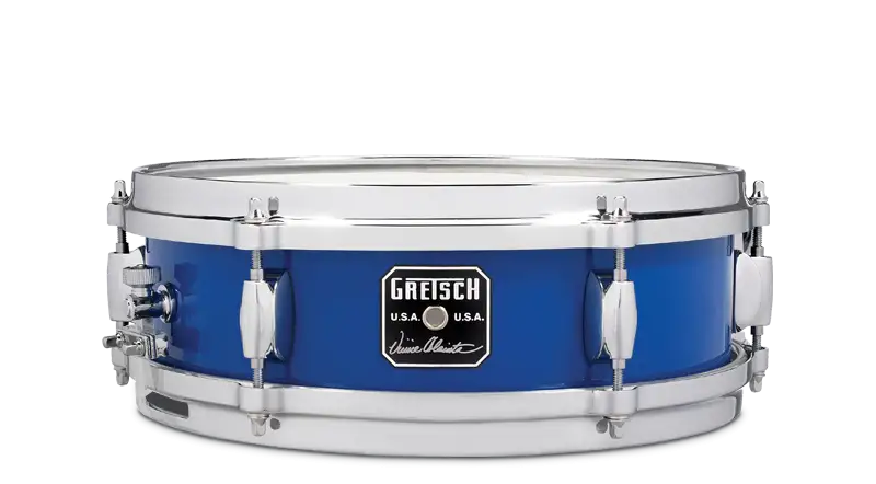 The 4" × 12" auxiliary snare is ultra-loud when laid into with a rimshot. The drums are finished in a distinctive Cobalt Blue to compliment the Gretsch USA Custom kit used on the Sting/Peter Gabriel “Rock, Paper, Scissors” World Tour.