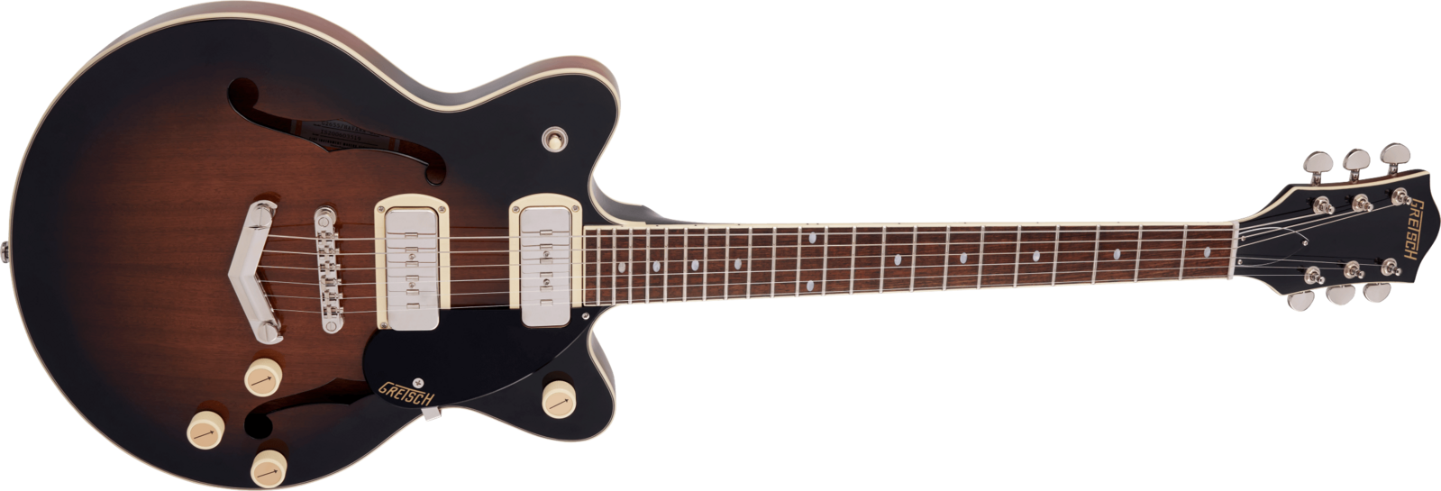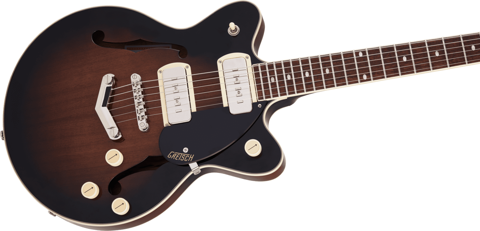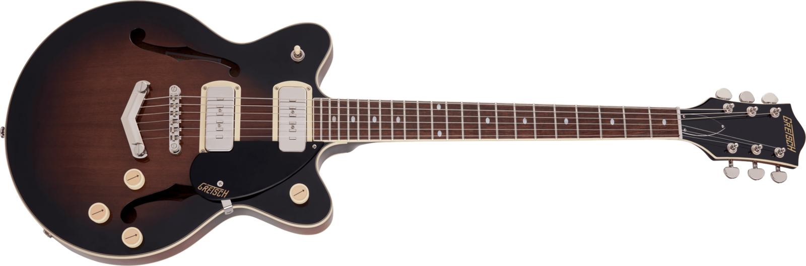 Classic ‘50s and ‘60s Gretsch eye-catching style is also here—all-new “radio arrow” control knobs, enlarged F-holes for increased acoustic projection, stylized pickup bezels, elegant aged white binding with upgraded purfling, one-ply black pickguard, slick-looking nickel hardware and standout finishes including Brownstone and Claret Burst. Easy to play while rocking out thanks to its smaller 14” body, the G2655-P90 is a phenomenal instrument for the modern musician who wants to control the stage and the audience while standing out from the pack.
