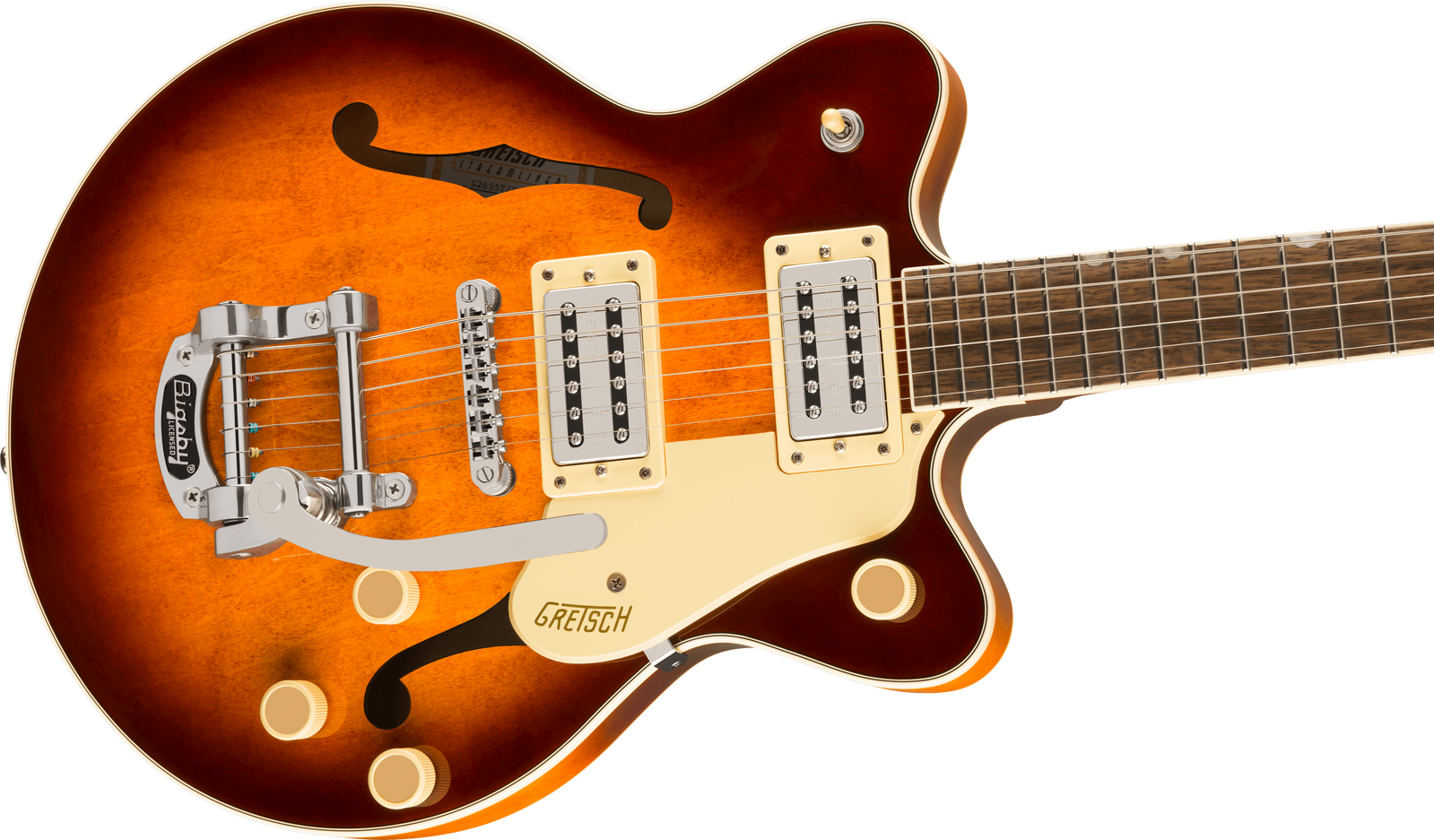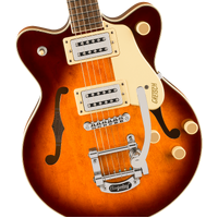 The G2655T Streamliner™ Center Block Jr. Double-Cut with Bigsby® bursts into the modern era with powerful sound and style in a smaller package. The sleek G2655T is designed for the guitarist who demands more than the mundane from an instrument - more performance, more style and most importantly, more volume - while retaining everything you expect from a Gretsch.
