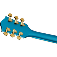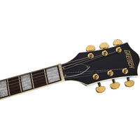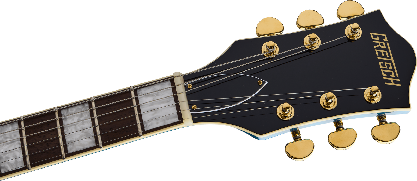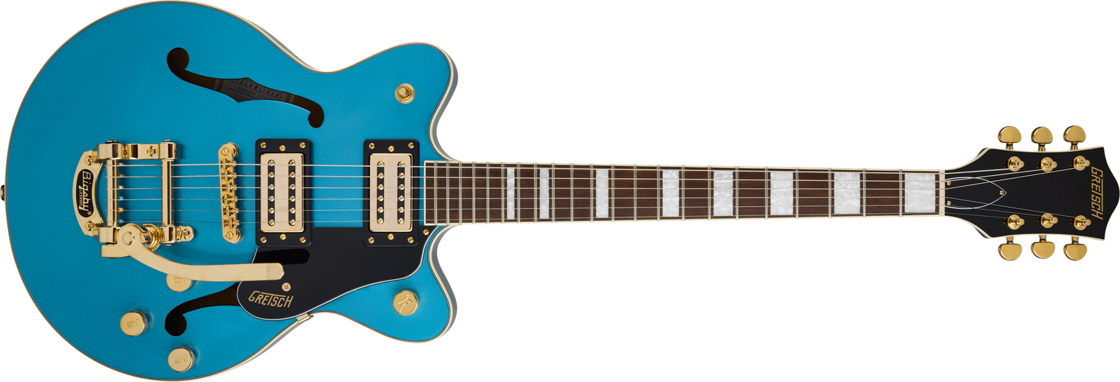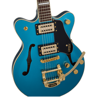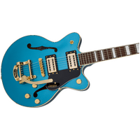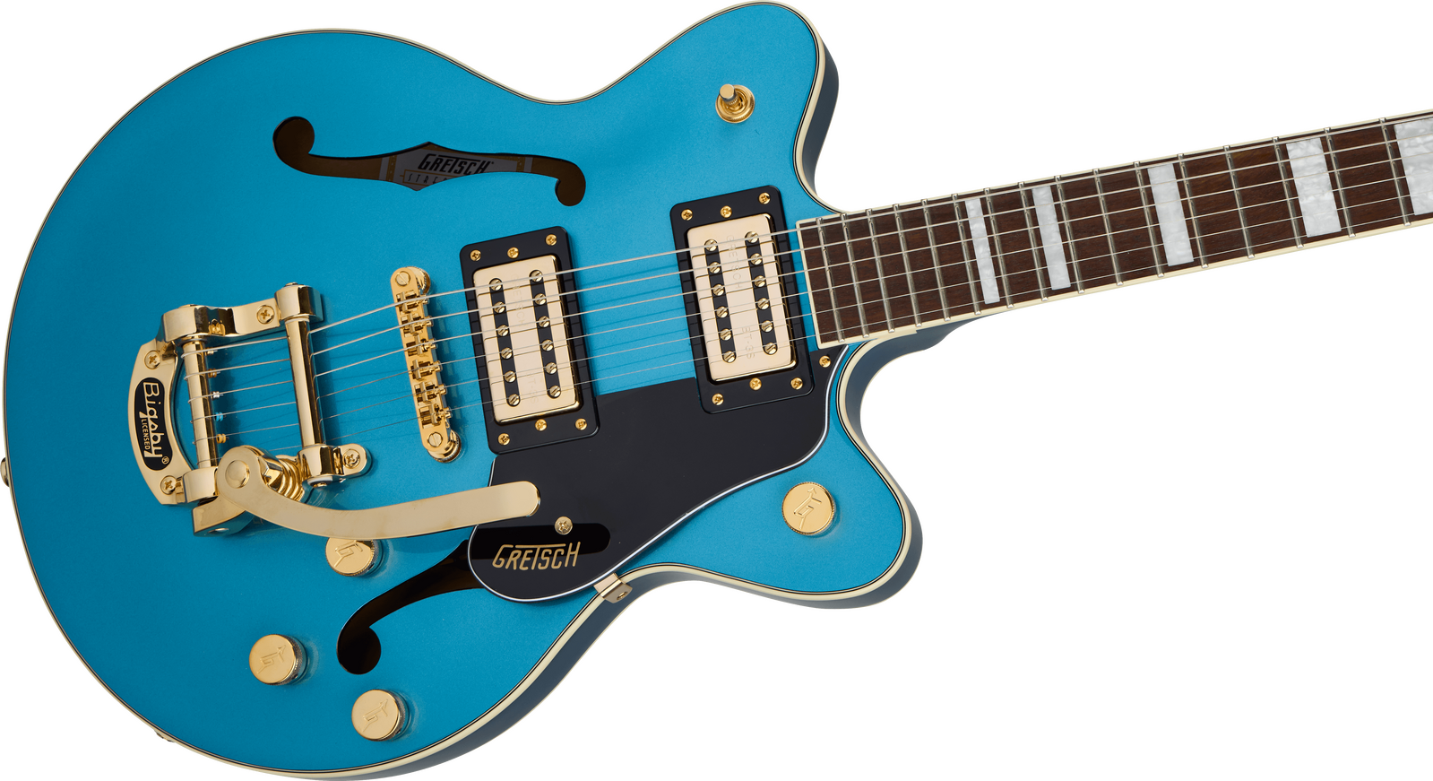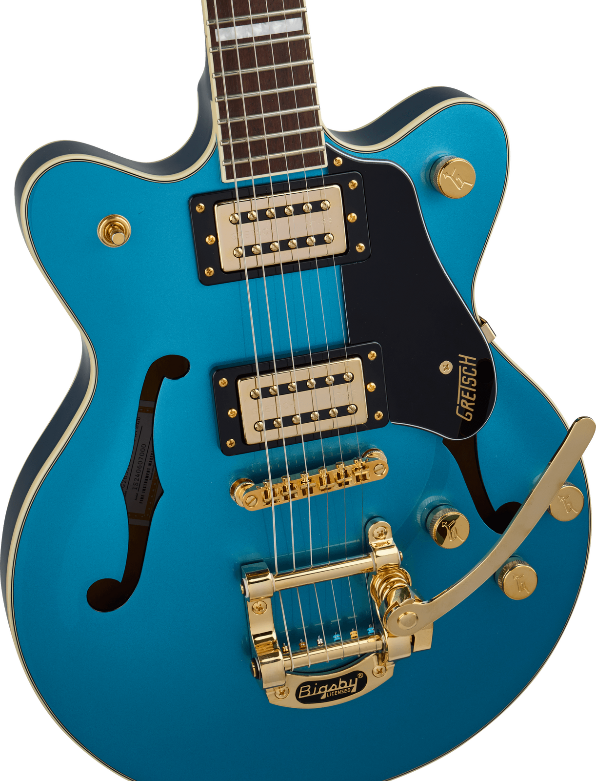 The Limited Edition G2655TG Streamliner™ Center Block Jr. Double-Cut with Bigsby® bursts into the modern era with powerful sound and style in a smaller package. Featuring gleaming gold hardware, metal G-Arrow control knobs, and pearloid Big Block inlays, this limited edition version is designed for the guitarist who demands more than the mundane from an instrument - more performance, more style and most importantly, more volume - while retaining everything you expect from a Gretsch.