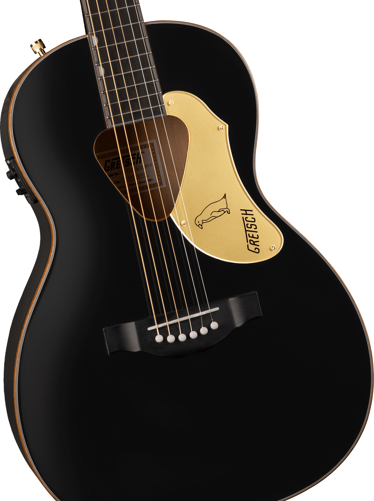 The Fishman® Presys III pickup/preamp system provides a modern sonic complement to classic touches including a solid spruce top with maple back and sides, mahogany neck, 12”-radius laurel fingerboard with 20 vintage-style frets, pearloid Neo-Classic™ thumbnail inlays and synthetic bone nut, laurel bridge, gold sparkle binding and vertical wing” Gretsch headstock logo, gold plexi pickguard, gold hardware, and more.