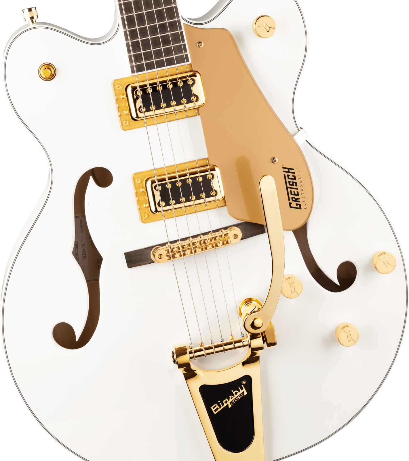 The G5422TG Electromatic® Classic Hollow Body Double-Cut with Bigsby® and Gold Hardware features a laminated maple body with vintage-inspired perimeters and refined arches, as well as all-new trestle block bracing to help reduce unwanted feedback. By increasing rigidity and contact between the top and back of the body, the new trestle block design also results in the sound having a faster attack with more focus, snap, and increased sustain. Coupled with all-new FT-5E Filter’Tron™ pickups, this hollow build’s voice explodes with huge full-bodied punch, classic chime and enhanced presence, clarity and note definition.
