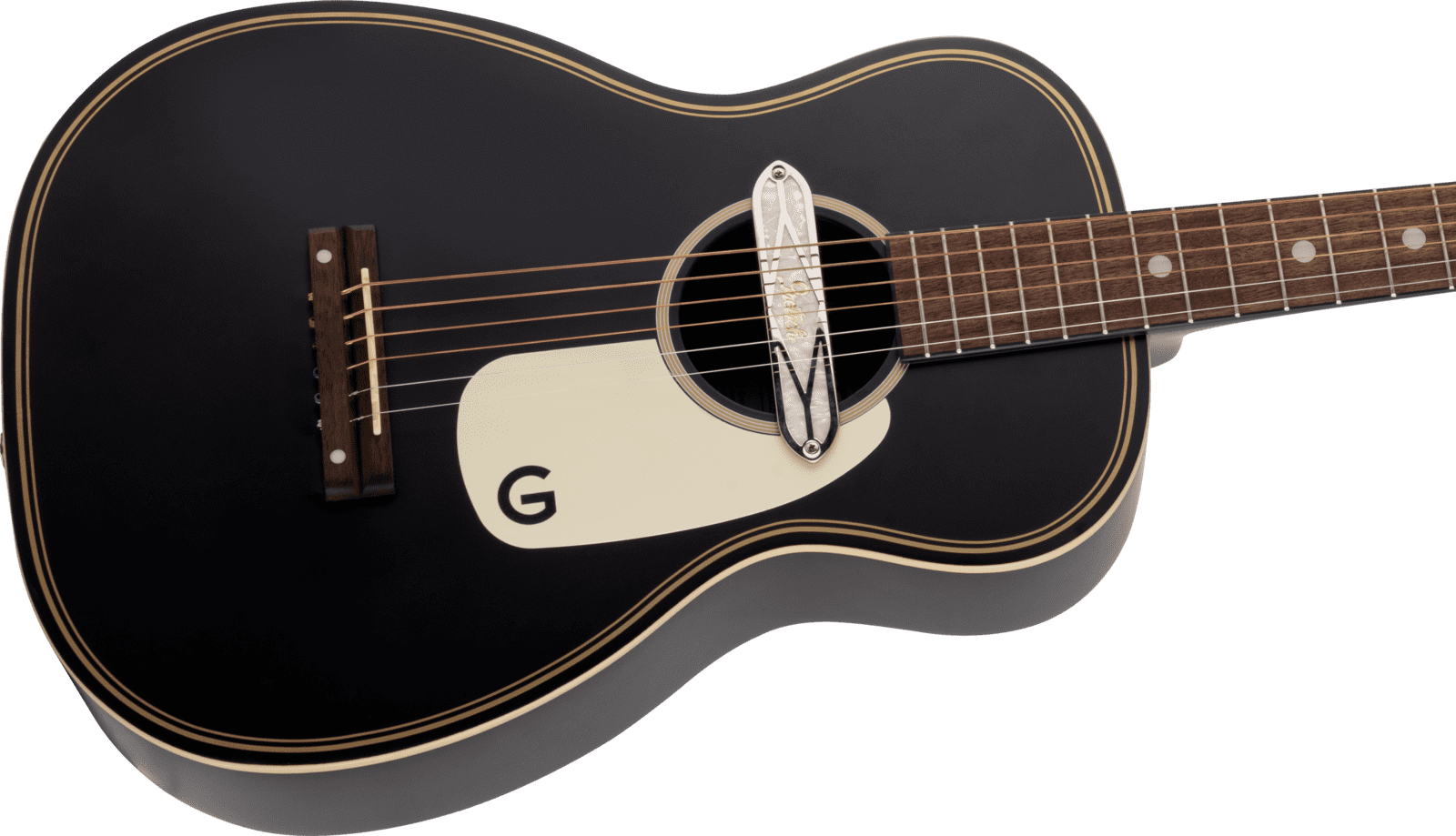 • Gretsch® Deltoluxe soundhole pickup with gold/white rosette rings