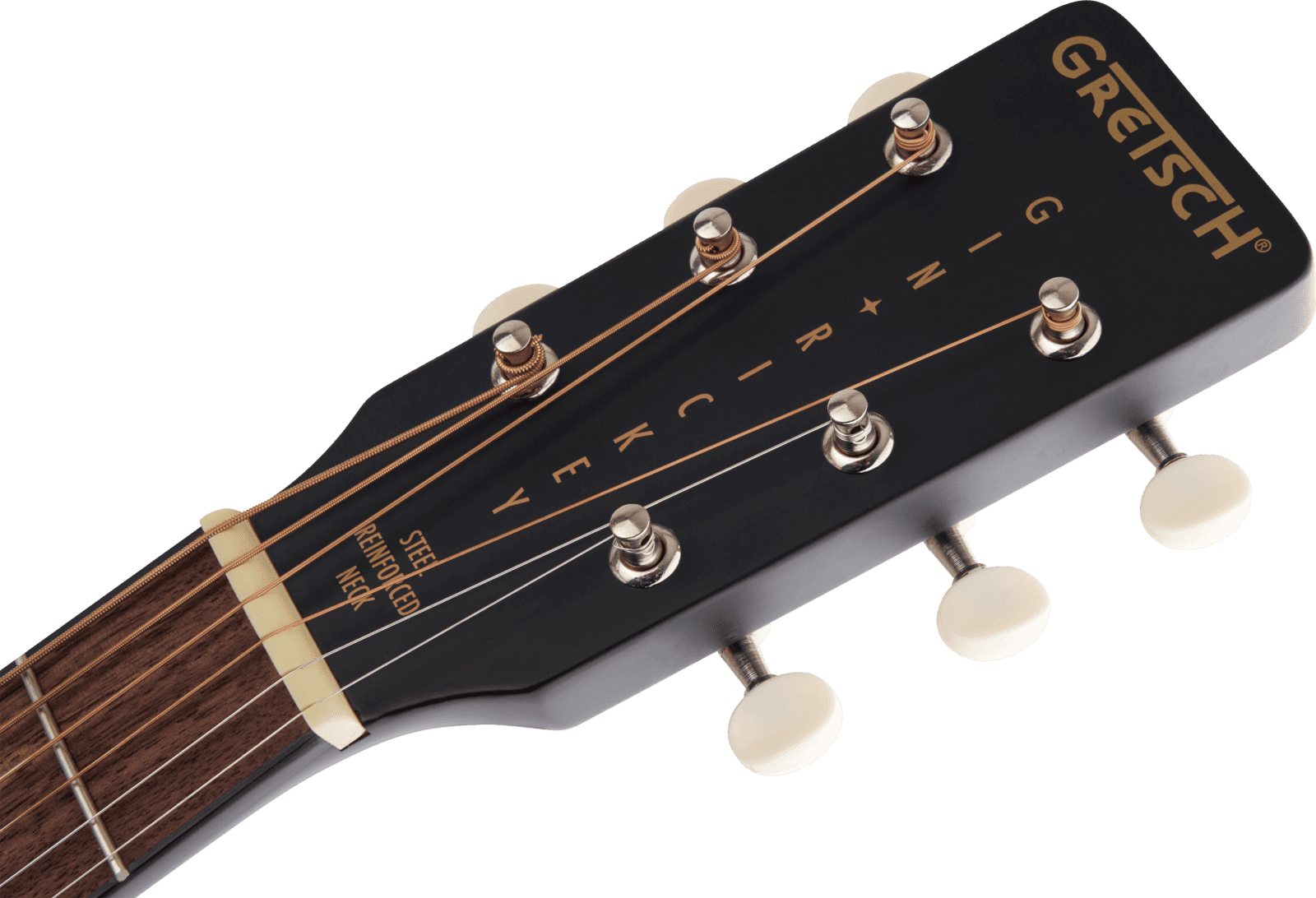 What else? You’ve got aged white body binding and an aged white “G”-graphic pickguard, gold-and-white soundhole rosette with gold double-line top striping, nickel hardware, vintage-style end-pin strap buttons and open-gear die-cast tuners, and a hot Smokestack Black finish.