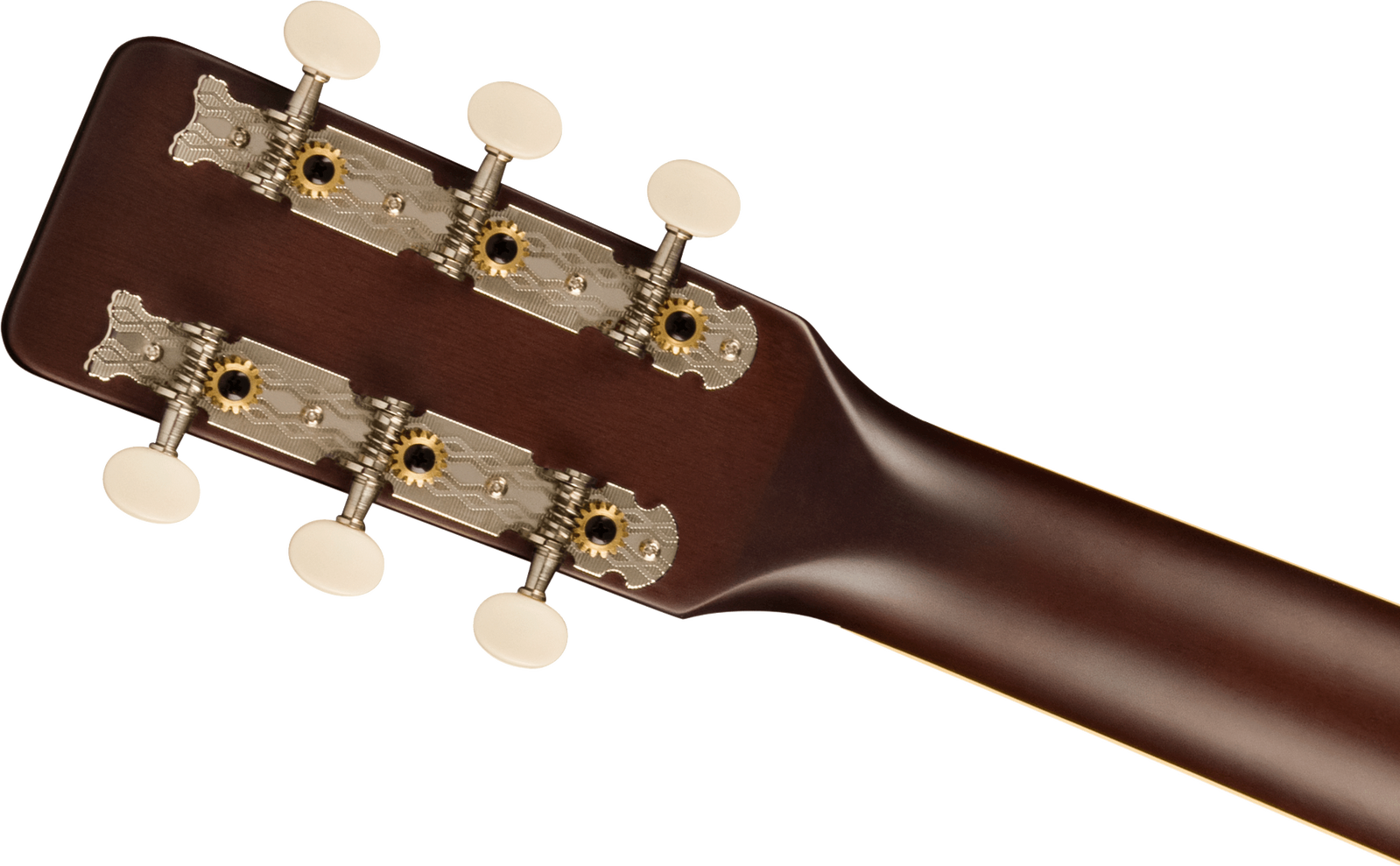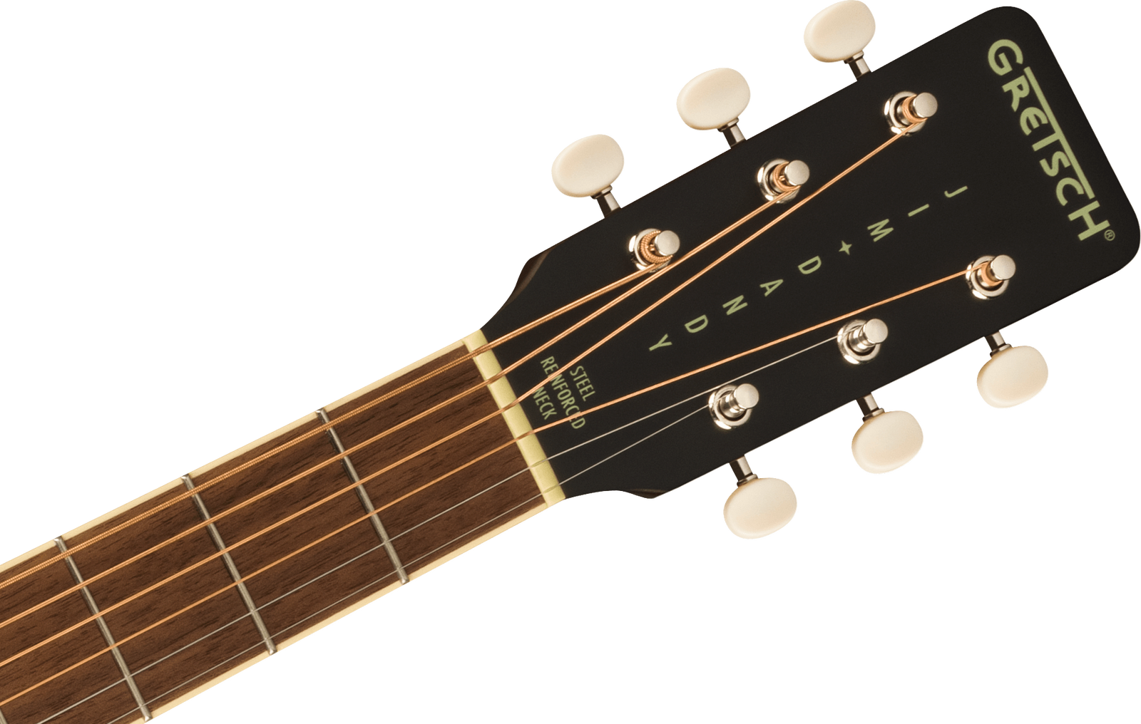 The X-braced body is crafted with select lightweight laminate tonewoods for an optimal balance of woody vintage tone and reliable durability, while the “C”-shape neck presents an inviting feel for hours of old-timey inspiration. Period-correct details such as a vintage-style pinned bridge, “G”-graphic pickguard, painted pinstripe purfling, 3-on-a-plate open-gear tuning machines and oversized dot fingerboard inlays combine for a nostalgic personality destined for any barnburner or jamboree.