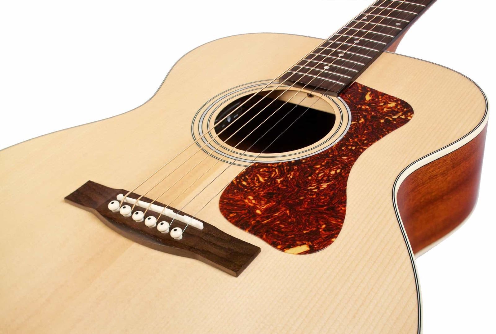 This mid-sized orchestra shaped acoustic is equally suited for strumming and fingerpicking, and produces a sweet, balanced tone. The perfect choice for the versatile musician, the OM-240E features a solid Sitka spruce top, mahogany sides, and arched mahogany back. Guild’s signature arched back design allows for great volume and projection, long sustain, and a lush, full sound. The OM-240E features Guild’s AP-1 pickup, an Indian rosewood fingerboard and bridge, bone nut and saddle, pearloid rosette, period-correct tortoiseshell pickguard, and a matte polyurethane finish. This model also includes Guild’s new lightweight deluxe gig bag. Available in Natural.