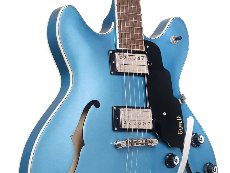 Guild’s most iconic electric guitar is now available to a whole new range of players. Expanding on the double cut body shape made famous by the Guild Starfire, the Starfire I DC features semi-hollow body construction utilizing a mahogany center block for reduced feedback and clear sustain. Retaining the airy, crisp tone you would expect from a semi-hollow body, The Cherry Starfire I DC features an elegantly arched mahogany top, back, and sides; while the Vintage Walnut, Pelham Blue, and Emerald Green models feature an elegantly arched maple top, back, and sides. The 24 3/4” scale length and modern thin “U“ neck profile provide a fast, smooth playing neck, while the 18th fret neck-to-body joint provides easy access to the upper register of the fretboard. Premium Guild Vintage 18 tuners with 18:1 gear ratio and Tune-o-matic bridge ensure the strings are accessible and in tune. Rich, vintage tone is injected by Guild’s own HB-2 Alnico II humbuckers, and the push-pull coil splitting feature allows for singing, single coil tones from either pickup. All of these features come standard on the Starfire I platform. Available in Cherry Red or Vintage Walnut finish. For those looking for something a little extra, the Starfire I DC GVT comes equipped with Guild’s vibrato tailpiece featuring a roller tension bar for additional tonal versatility. Available in Pelham Blue or Emerald Green.
