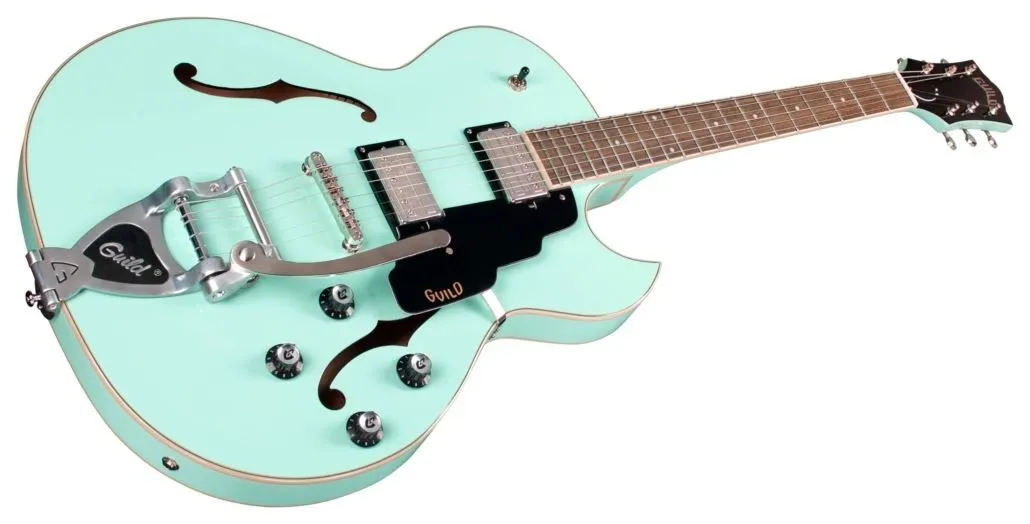 An affordably priced, single cut Starfire has arrived. Based on the timeless Starfire II and III single cut body shape, the Guild Starfire 1 SC features a 2“ thick, hollow body with an added bridge block to increase bridge stability and improved resonance. Made with a sturdy arched maple top, back, and sides, the Starfire I SC has the airy tonality of a hollow body instrument with bright overtones and pronounced lows. The 24 3/4” scale length and modern thin “U” neck profile provide a fast, smooth playing neck, while the premium Guild Vintage 18 tuners and Tune-o-matic bridge ensure the strings are accessible and in tune. Rich, vintage tone is injected by Guild’s own HB-2 Alnico II humbuckers, and the push-pull coil splitting feature allows for singing, single coil tones from either pickup. All of these features come standard on the Starfire I platform. Available in Antique Sunburst. For those looking for something a little extra, the Guild Starfire 1 SC GVT comes equipped with Guild’s vibrato tailpiece featuring a roller tension bar for additional tonal versatility. Available in Seafoam Green and Snowcrest White finishes.