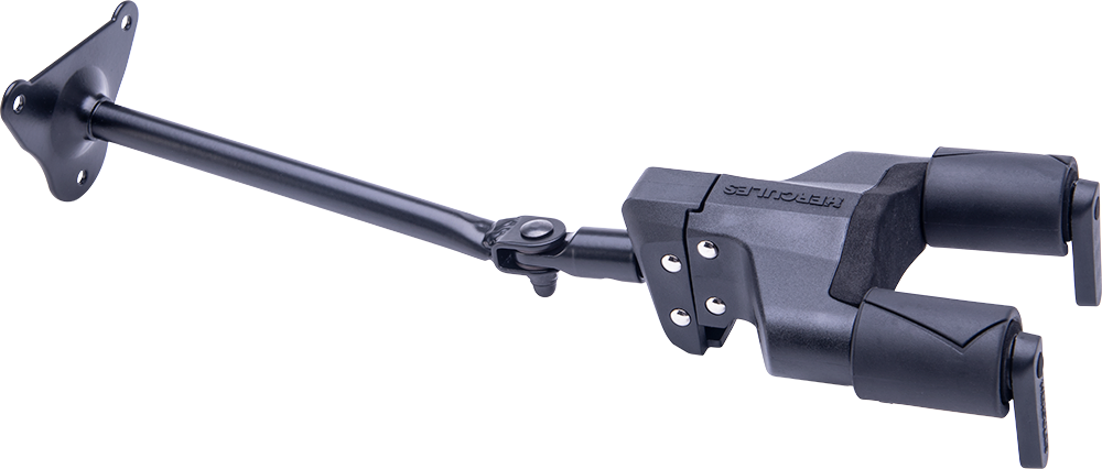 The HERCULES Auto-Swivel/Adjustable Yoke Hanger GSP40WB PLUS rotates to accommodate most guitars and pivots left or right so you can display the instrument facing various directions. It features a screw-in standard wall mounting system for display use.