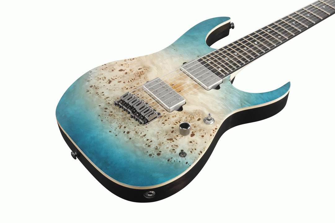 Designed to Inspire. All Ibanez Premium series models are manufactured using select tone woods, high-profile electronics, sturdy hardware and are built by the dedicated skills of master craftsmen. The richness of sound, stunning appearance and unrivalled playability of the Ibanez Premium series will open the gates of your reservoir of inspiration. One of the finest Premium models, the RG1127PB, comes with a wide range of distinctive features that will motivate any guitarist. The RG1121PB features a stunning Poplar Burl top with a beautiful Caribbean Islet Flat finish. The RG1127PB's 11pc Wizard neck is made of Maple, Walnut and Purpleheart which contributes to the neck’s extreme rigidity and massive sustain. The Ebony fretboard provides a tight response and features Jescar EVO gold frets with Premium fret edge treatment. Jescar EVO gold frets are known for their bright tone, gorgeous gold appearance and player-friendly features such as long durability and smooth note bending. The luminescent side dot inlays makes it easy for players to see while on dark stages. The RG1127PB is loaded with DiMarzio® Covered Fusion Edge pickups, the amazing product of a collaboration between DiMarzio® and Ibanez. Fusion Edge pickups provide great clarity and a very smooth response with sonic variations possible by utilizing the coil-tap switch. The RG1127PB uses Belden wiring material and copper shielding inside the control cavity for absolutlely noiseless sound. Designed for both stability and sustain, the innovative Ibanez Mono-Rail bridge minimizes cross-talk between strings and facilitates flawless intonation. The Gotoh ® MG-T locking machine heads achieve incredible tuning stability and make string-changing quick and easy. A gig bag included.