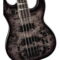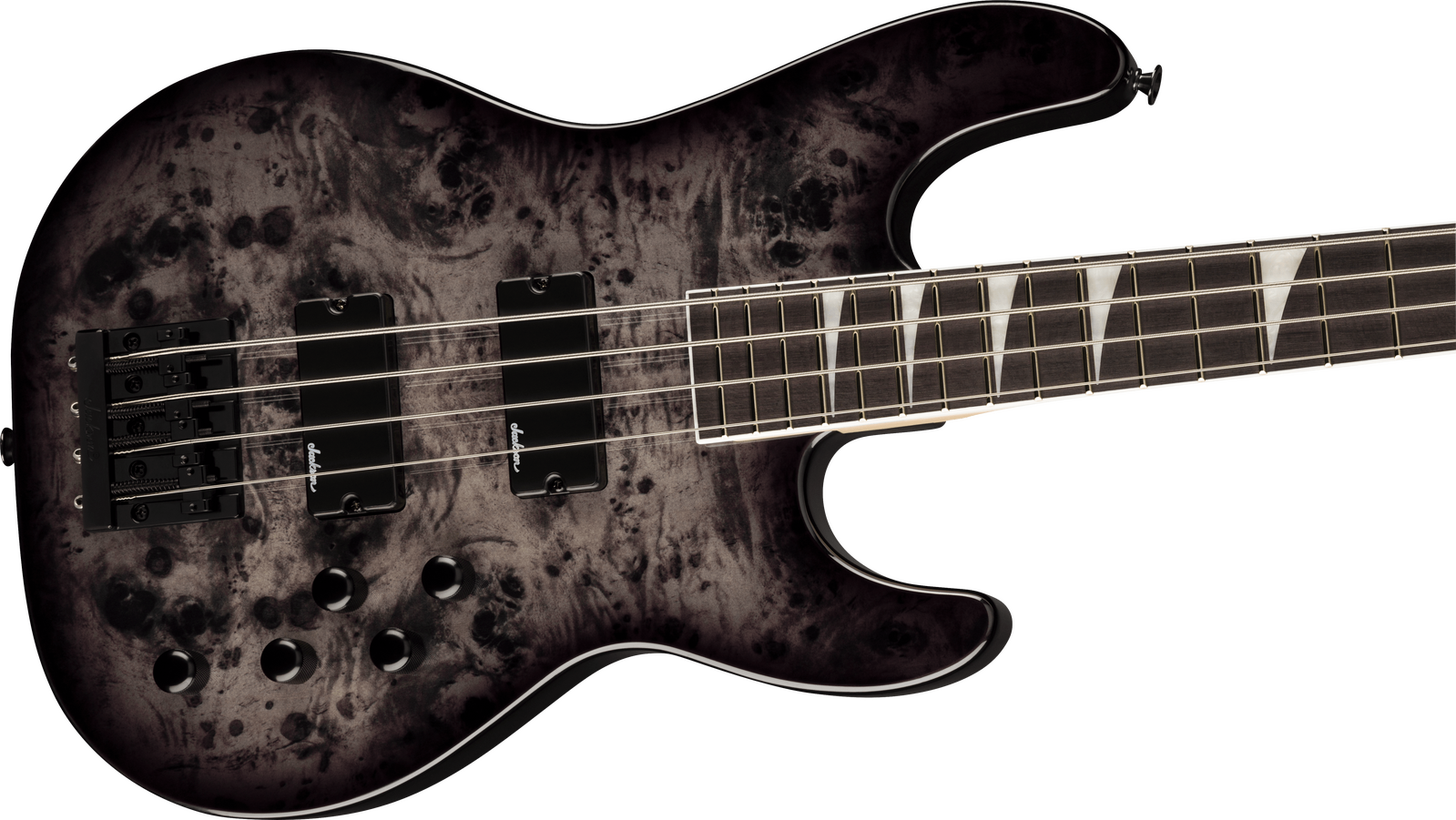 Dual Jackson high-output humbucking bass pickups create a monstrous low-end growl, while a HiMass™ bridge provides rock-solid stability, improved sustain and bolder tone. Tone can be refined and tweaked with a pair of volume controls and an active three-band EQ. Loaded with vibe and value, the Concert Bass JS3P is available in Black Burst Burl and Transparent Black finishes with black hardware.