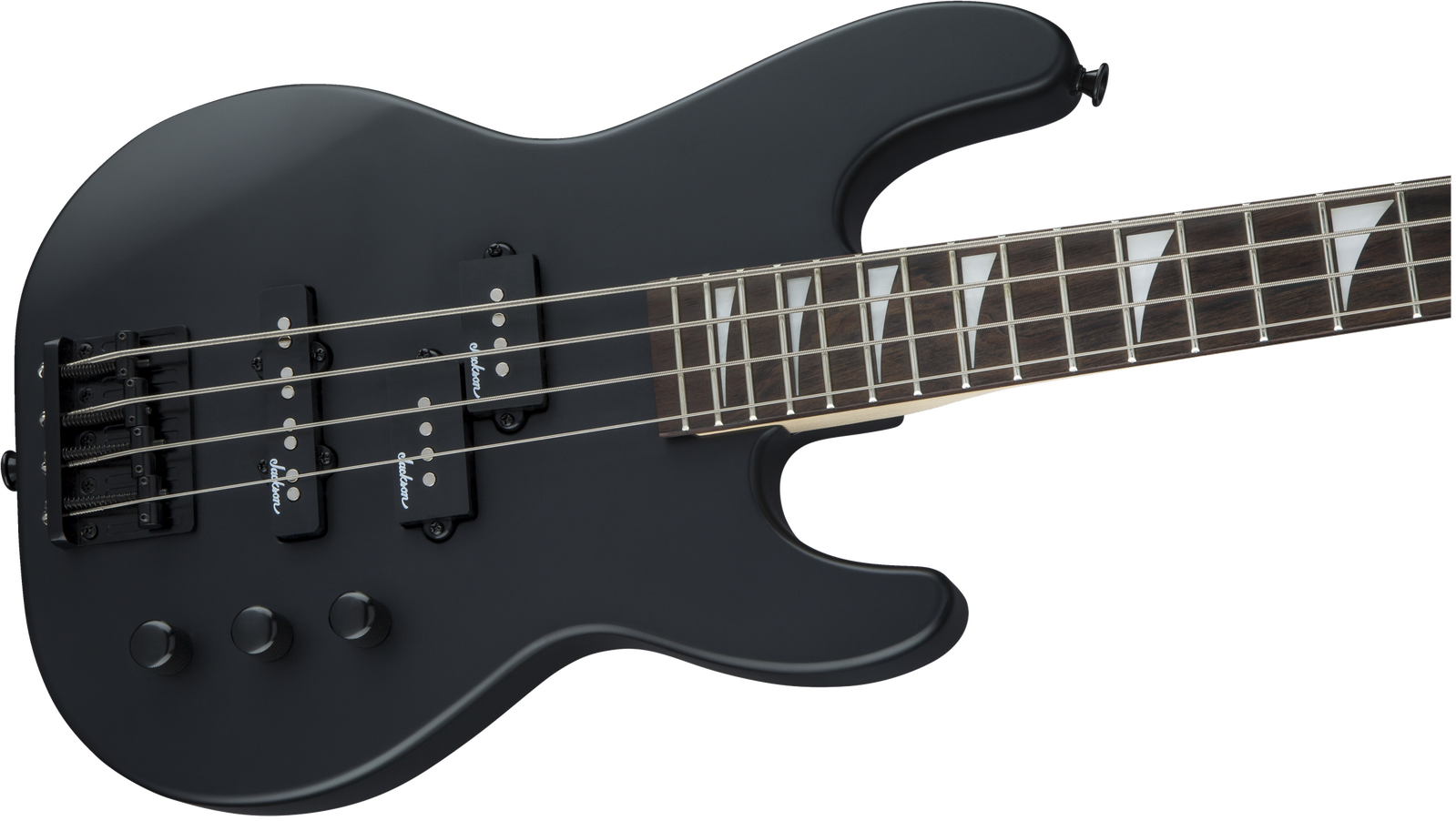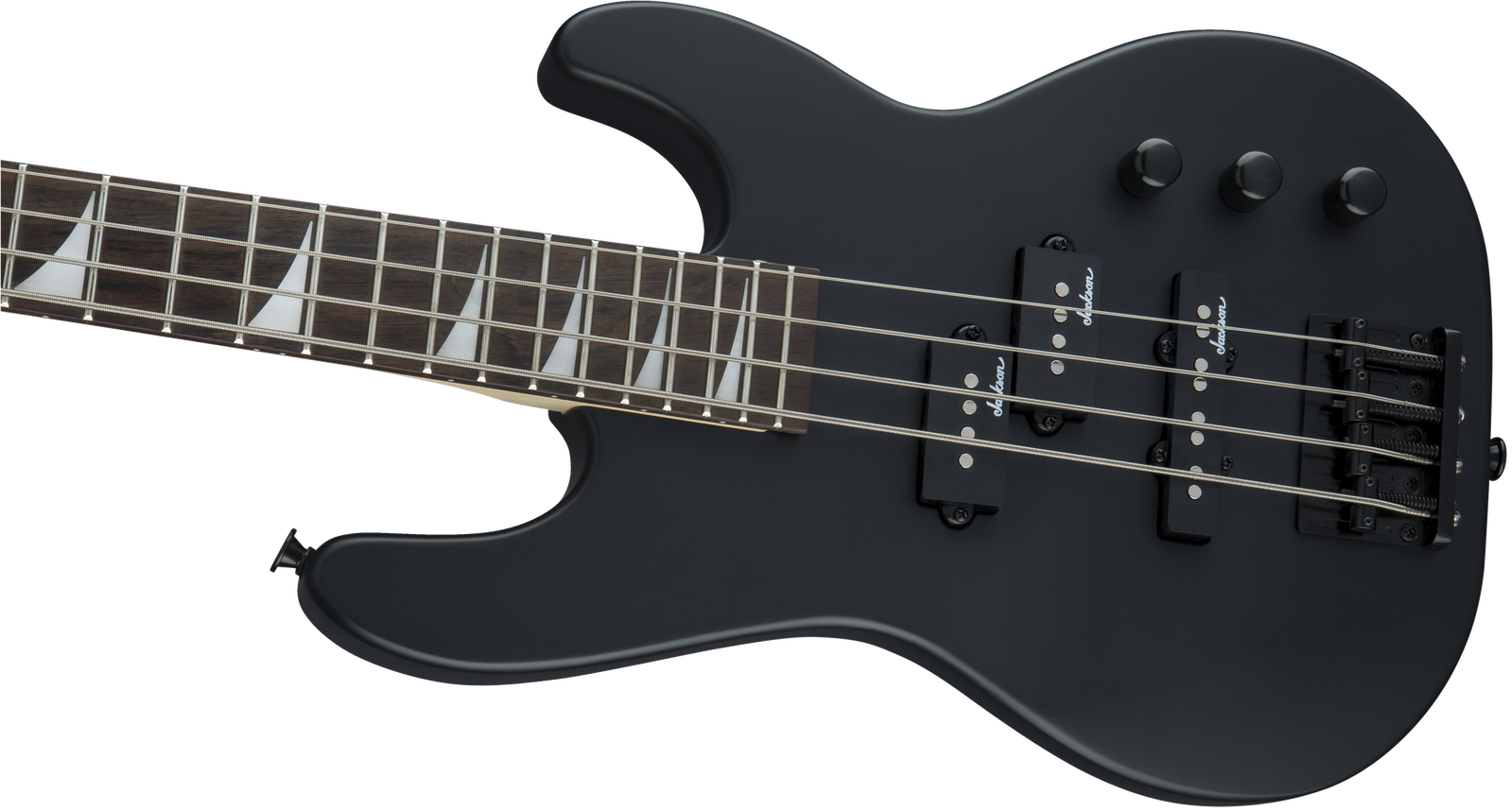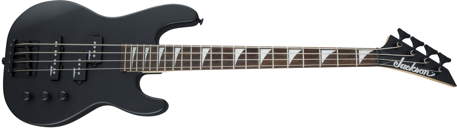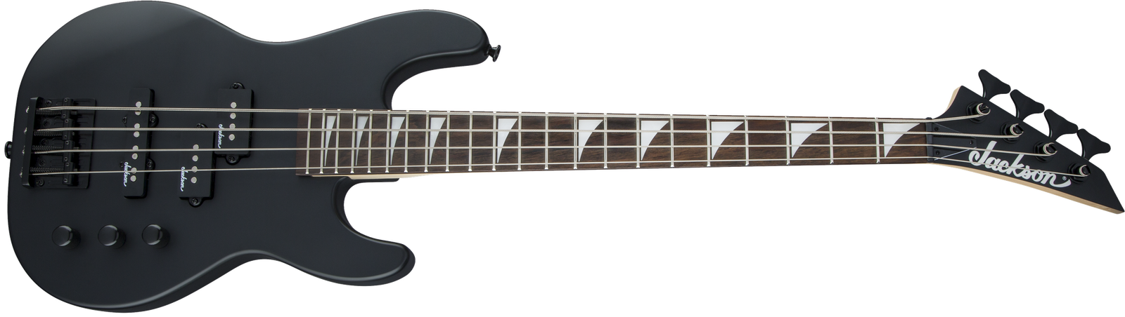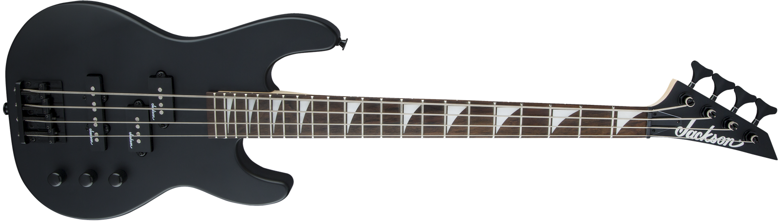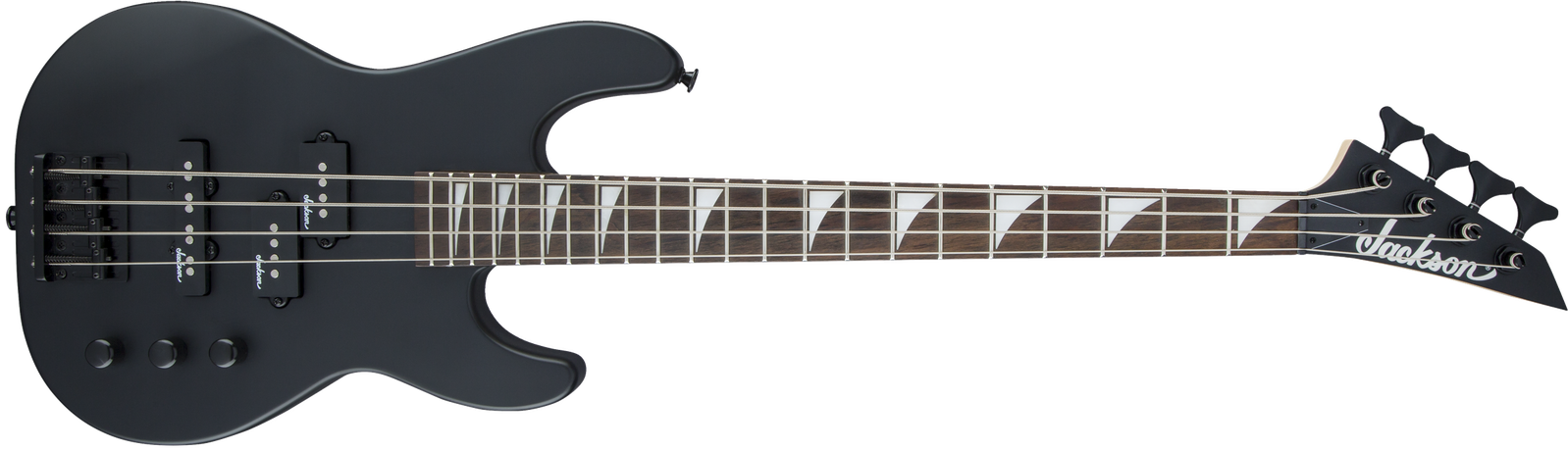 A Jackson P style neck pickup and Jackson J style bridge pickup power this 4-string bass, which also features a pair of volume knobs, single tone knob, hardtail bridge with black base plate and Jackson-branded tuners.