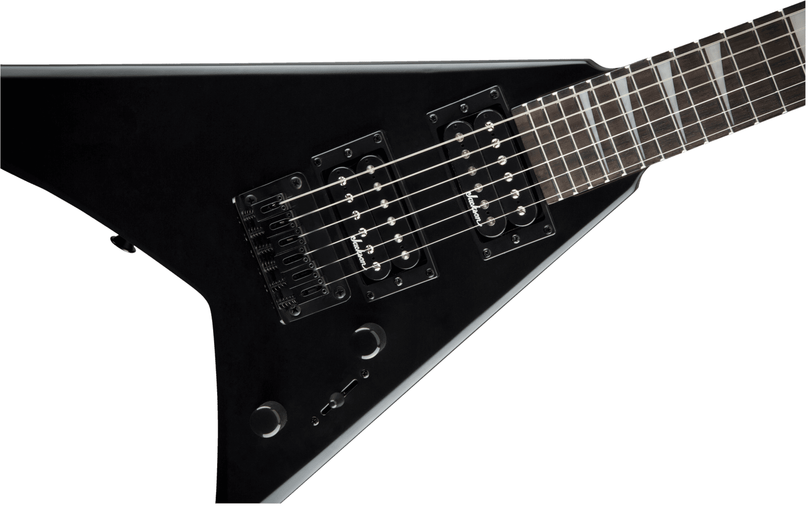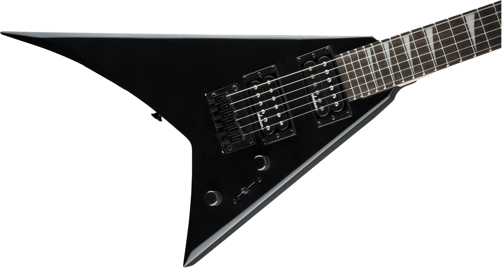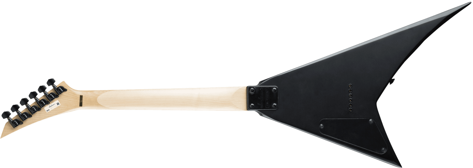 Other features include dual Jackson high-output humbucking pickups with three-way blade switching, single volume and tone controls, string-through-body hardtail bridge with block saddles and black hardware.